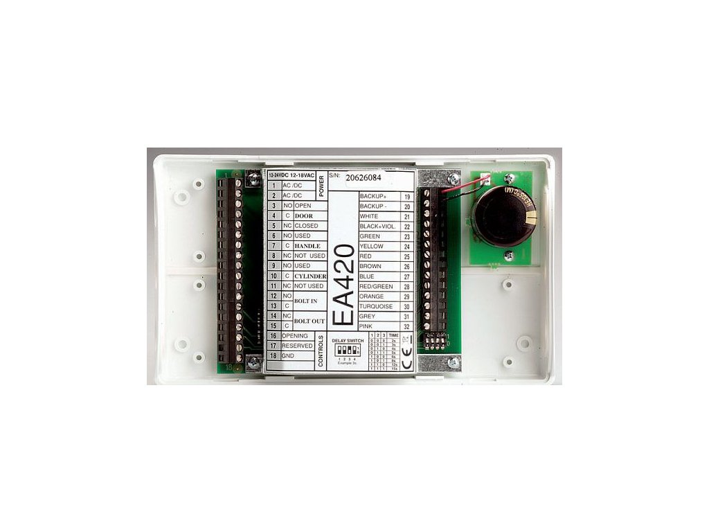 - zámek je propojen s externí ústřednou EA420, která je součástí dodávky. Pomocí ústředny lze nastavit dobu odemčení zámku (2-15s), ústředna obsahuje svorky pro připojení monitorovacích kontaktů