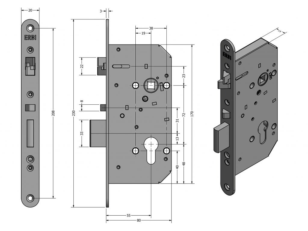 - Rozměry čela zámku: 235 x 20 x 3 mm, R10, nerez.