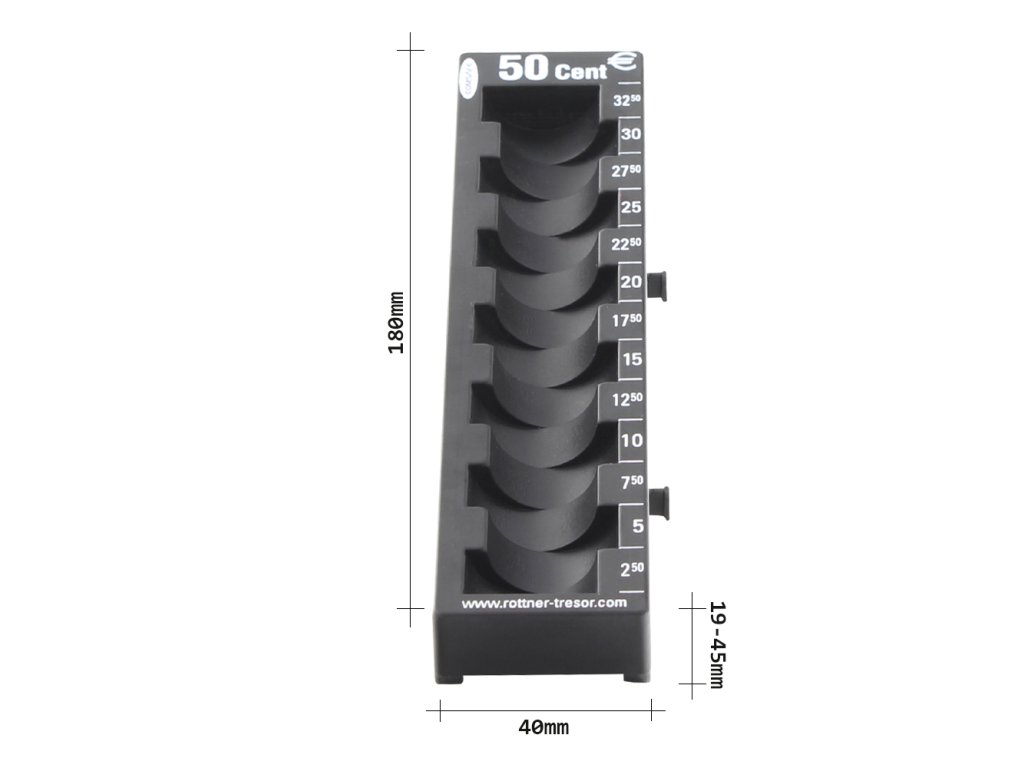 Hlavní výhody: Pro 50-centové euromince Systém skládání s dalšími přihrádkami Snadná organizace a počítání euromincí Kvalitní plast Černá přihrádka na mince Rottner Cent 50 disponuje praktickým místem pro uložení 50 centů euromincí. Výhodou přihrádky je možnost skládání do větších celků s dalšími přihrádkami. Na boku se nachází stupnice pro rychlejší přepočítání uložené hotovosti. Zároveň je zadní strana přihrádky mírně vyvýšená, aby se s ní lépe manipulovalo.Doplňkové parametry