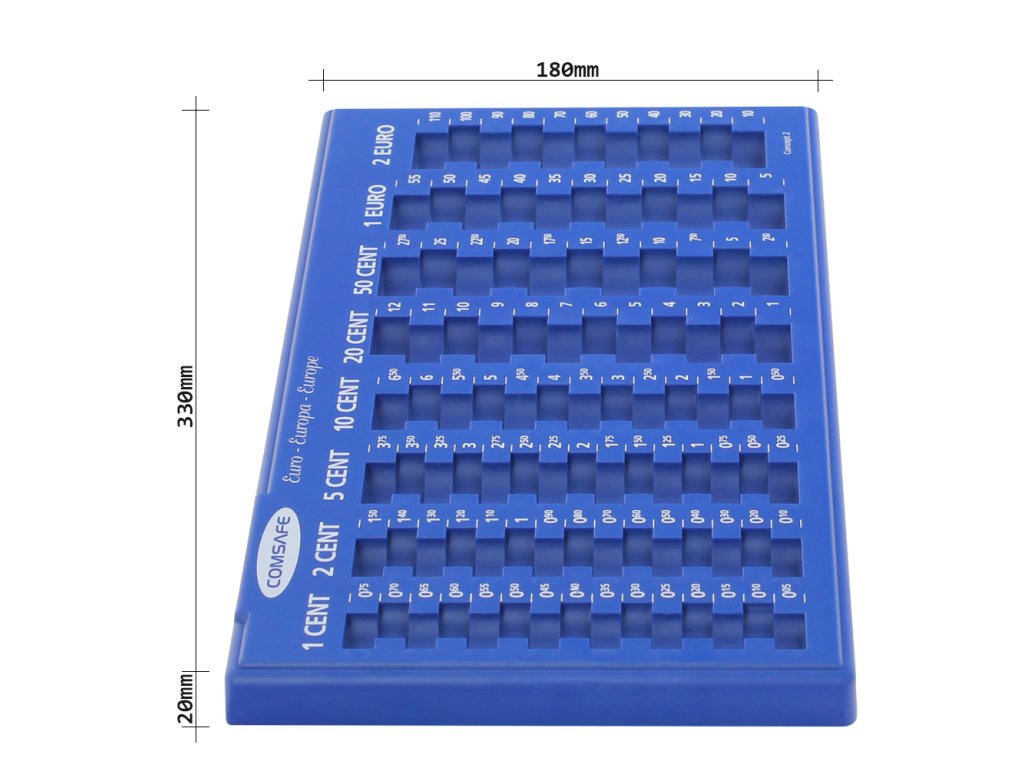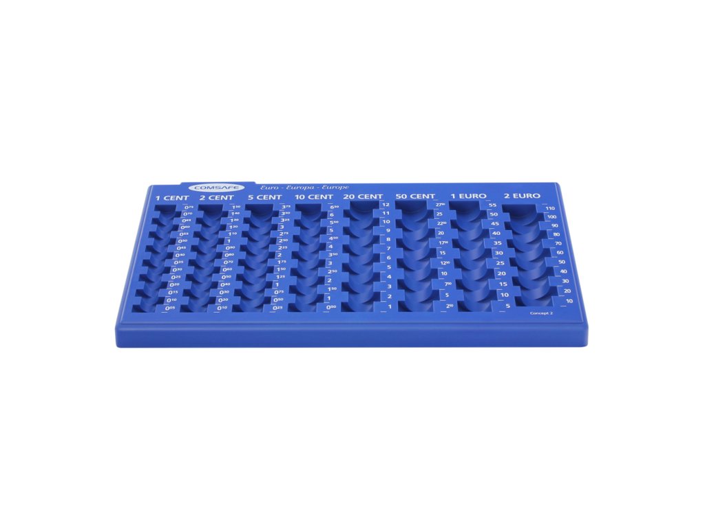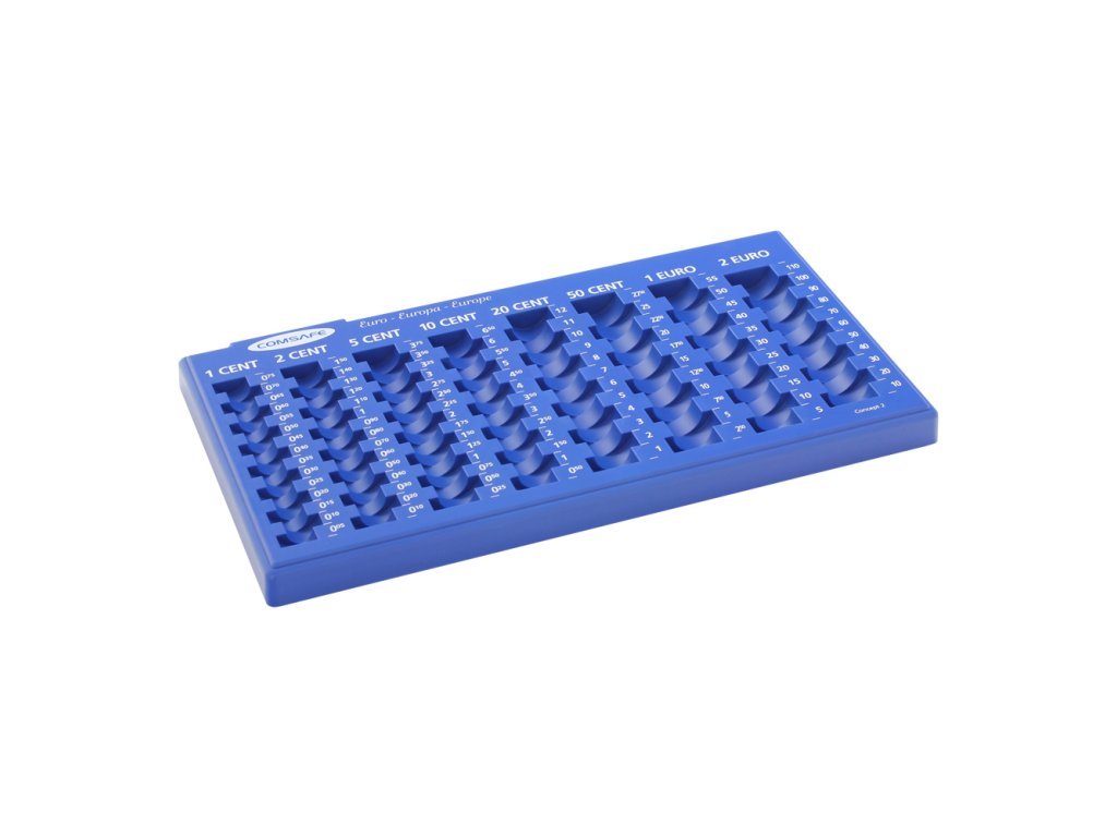 Hlavní výhody: Přehledné a lehké třídění Jednodílné provedení s 8 přihrádkami Možnost kombinovat s některými pokladničkami Modrý euromincovník nabízí celkem 8 přihrádek pro euromince všech nominálních hodnot. Přehledné uložení euromincí v hodnotě od 1 centu až po 2 eura. Zároveň tímto způsobem rychle uložené mince přepočítáte a roztřídíte. Výhodou euromincovníka je možnost použití v některých modelech pokladniček. Jednoduchý a přitom praktický doplněk, který pomůže.Doplňkové parametry