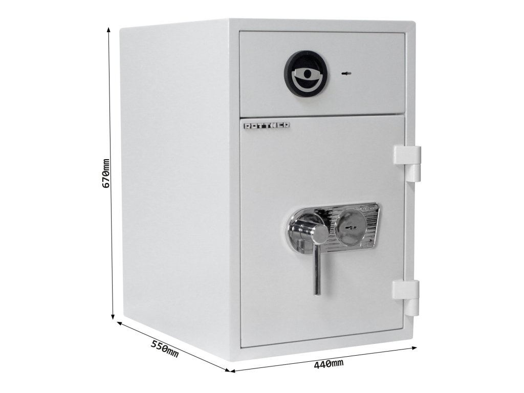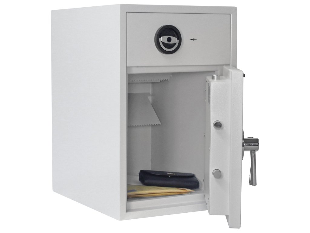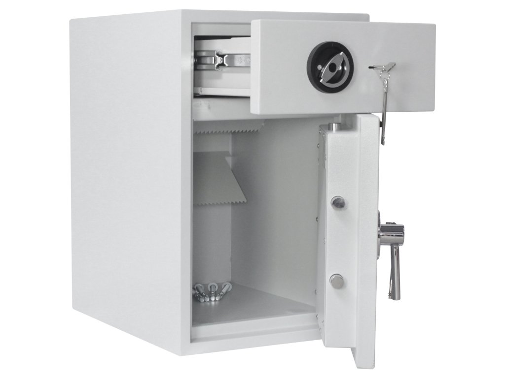 Hlavní výhody: 2 x certifikovaný trezorový zámek Vhozové zásuvka se samostatným trezorovým zámkem Bezpečnostní třída I (ČSN EN 1143-1) Horní vhozová zásuvka 3-stranný uzamykací mechanizmus Otevření dveří až do 180° Korpus tloušťky 40 mm a dveře tloušťky 85 mm Otvory na ukotvení na spodní straně trezoru Bílý vhozový trezor D1 65 DB/DB disponuje certifikovaným trezorovým zámkem jako na dveřích trezoru, tak i na vhozové zásuvce. Ke každému zámku se dodávají i 2 klíče. Trezor disponuje bezpečnostní třídou I (ČSN EN 1143-1). Horní vhozová zásuvka je chráněna proti nechtěnému vytažení vložených věcí. Vložené věci se po zavření zásuvky propadnou do spodní části trezoru. Následně je lze pohodlně vytáhnout otevřením předních trezorových dveří. Trezorové dveře se uzamykají 3-stranným uzamykacím mechanismem a lze je otevřít až do 180°. Na spodní straně se nacházejí otvory pro ukotvení. Kotvící materiál je součástí balení. Kování zámku zvyšuje celkovou vnější hloubku trezoru o 60 mm.