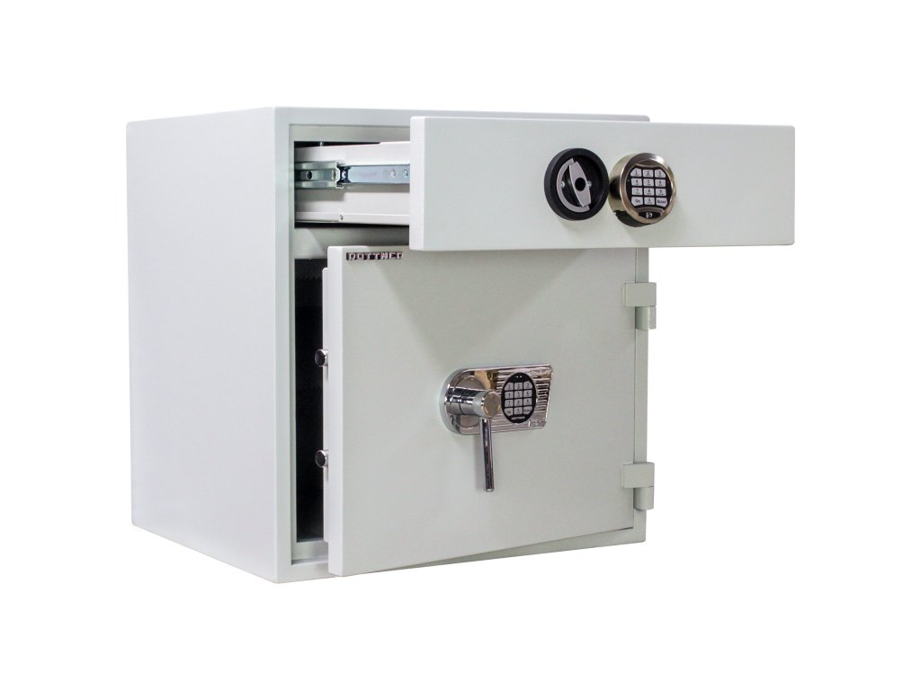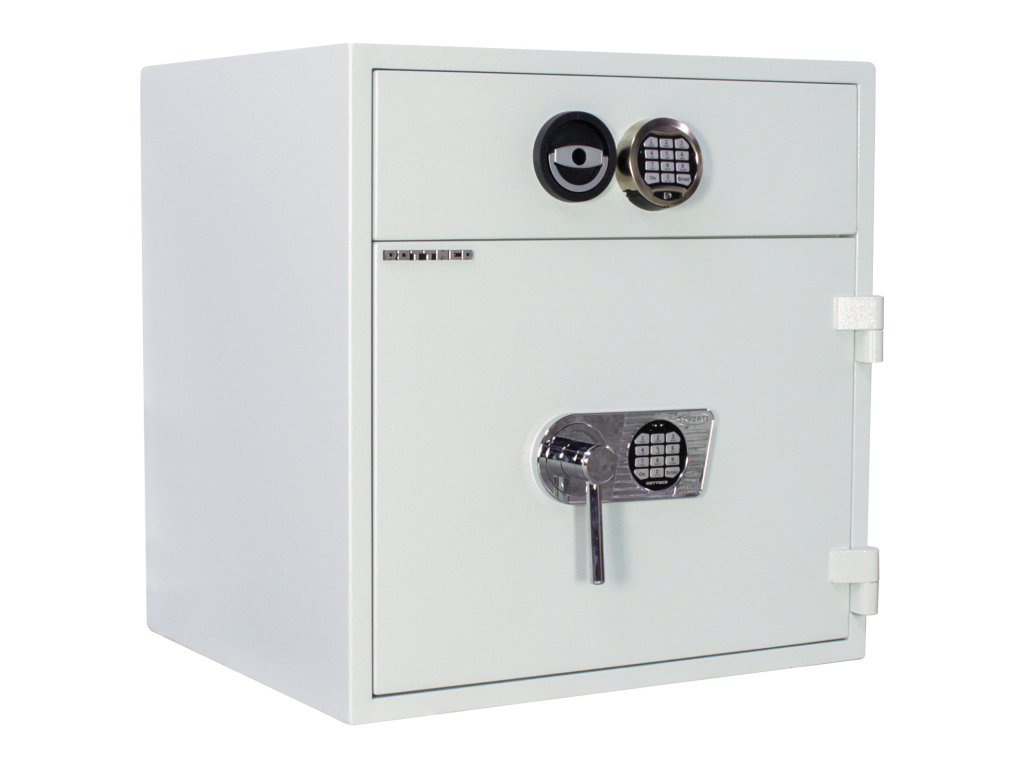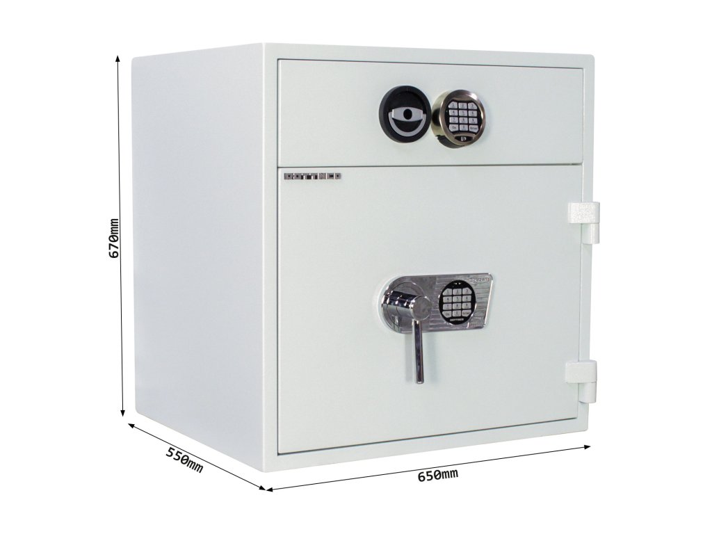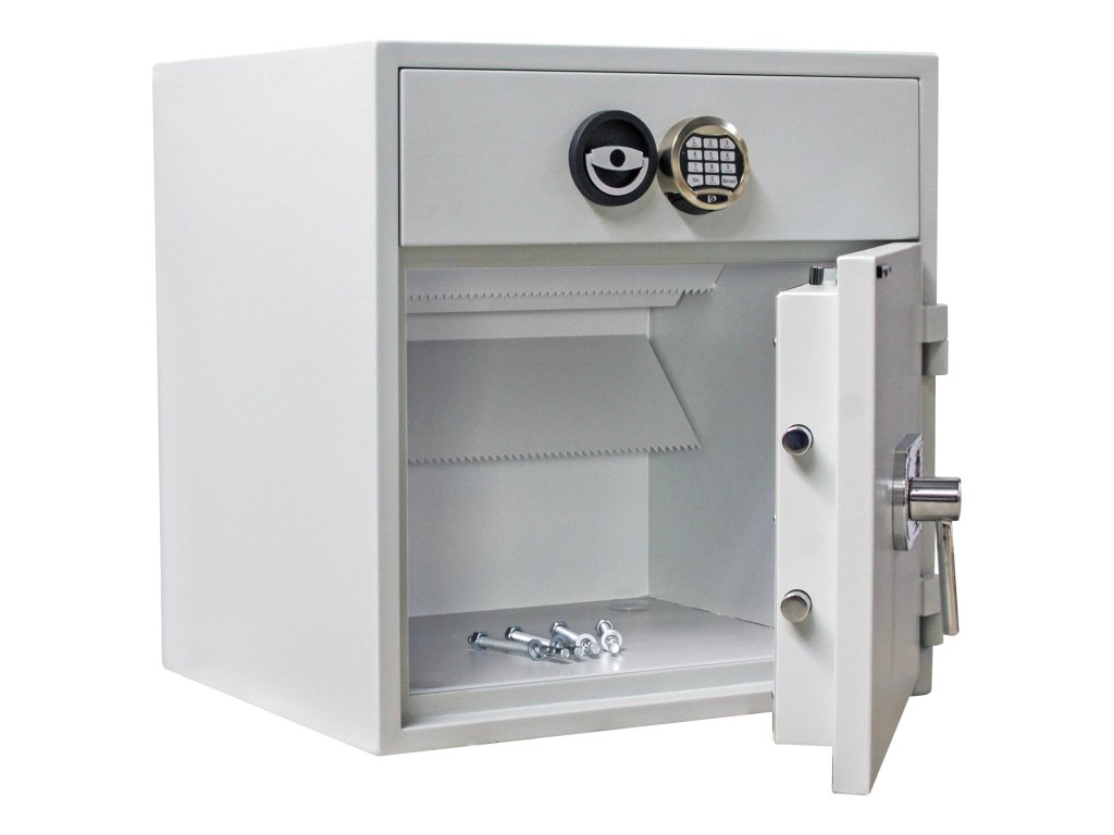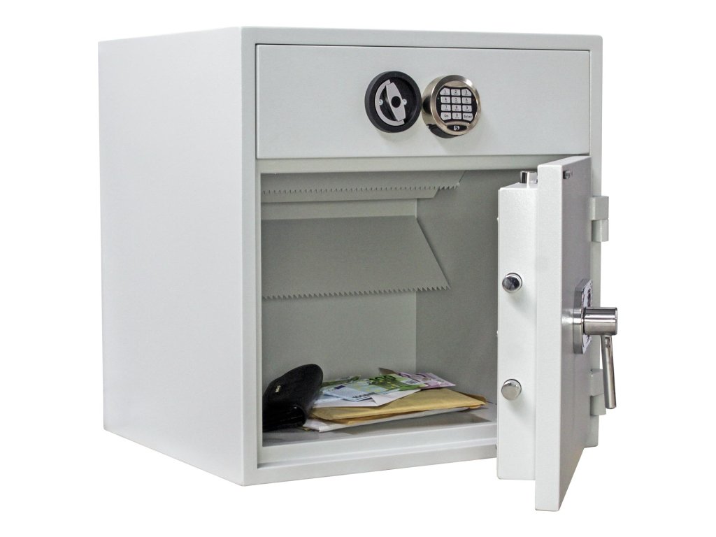 Hlavní výhody: 2 x certifikovaný elektronický zámek Vhozová zásuvka s elektronickým zámkem Bezpečnostní třída I (ČSN EN 1143-1) Napájení 2 x 9V bateriemi (nejsou součástí balení) Horní vhozová zásuvka 3-stranný uzamykací mechanizmus Otevření dveří až do 180° Korpus tloušťky 40 mm a dveře tloušťky 85 mm Otvory na ukotvení na spodní straně trezoru Vhozový trezor D1 70 s certifikovaným elektronickým zámek na vhozový zásuvce i trezorových dveřích je ideální možnost všude tam, kde se pracuje s hotovostí nebo menšími cennostmi, či dokumenty. Vhozová zásuvka se samostatným elektronickým zámkem po zasunutí zajistí vložený předmět propadl do spodní části trezoru. Následně je možné uloženou věc vybrat pouze přes přední trezorové dveře. Trezor disponuje bezpečnostní třídou I (ČSN EN 1143-1) a elektronické zámky jsou napájeny dvojicí klasických 9V baterii. Trezorové dveře se po zadání správného hesla uzamknou pomocí 3-stranného uzamykacího mechanismu. Skvělá možnost, jak přijímat nové cennosti nebo hotovost bez obav. Vhozové trezor disponuje otvory na spodní straně, které slouží k ukotvení. Kotvící materiál je součástí balení. Kování zámku zvyšuje celkovou vnější hloubku trezoru o 60 mm.