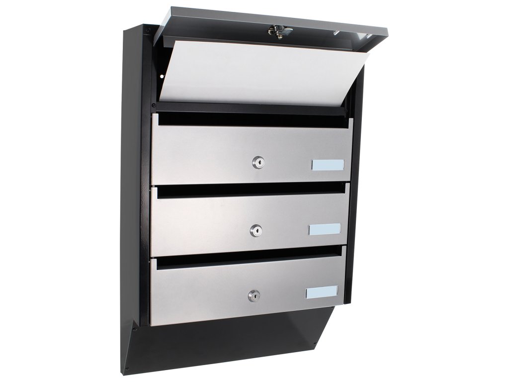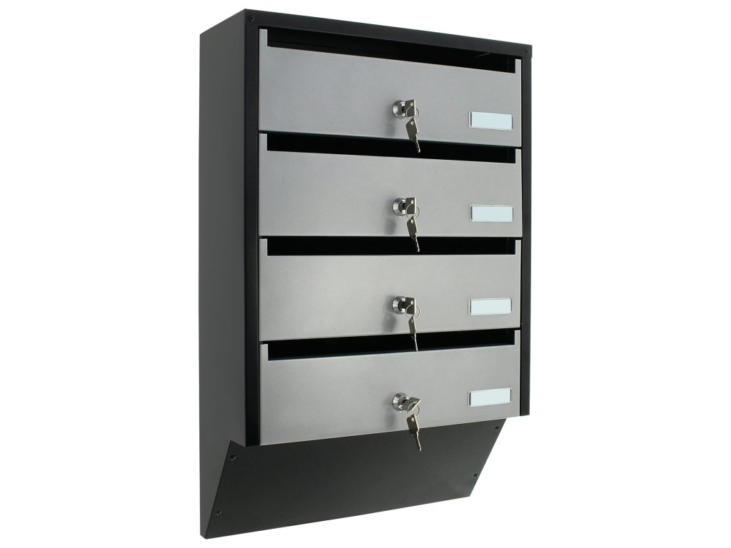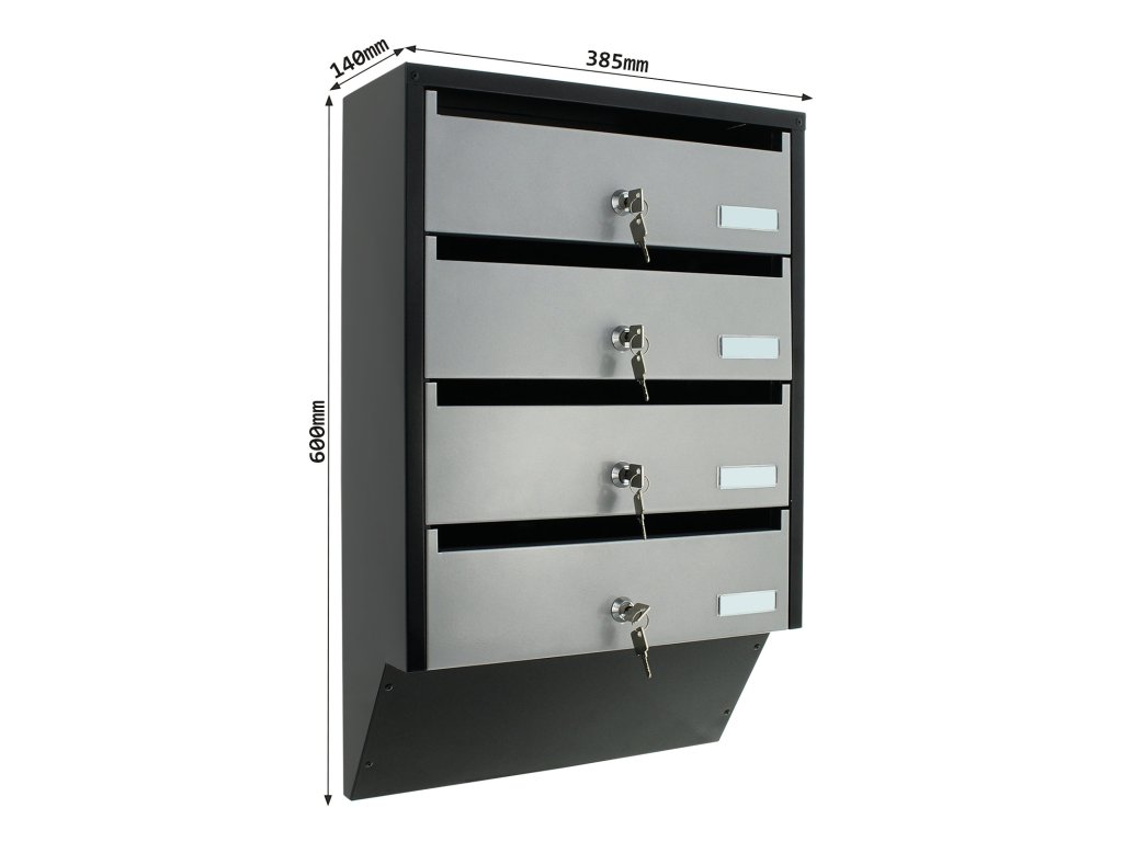Hlavní výhody: 4 samostatné složky Cylindrický zámek s 2 klíči pro každou složku Kvalitní ocel tloušťky 0,8 mm Samostatné jmenovky Přední otvor pro poštu Představujeme poštovní schránku se zajímavým úzkým designem, která je vhodná pro bytové domy nebo polyfunkční objekty. V jedné schránce jsou celkově 4 složky se samostatnými popisky a cylindrickým zámkem na klíč. Její design pomůže ušetřit množství místa, přičemž jednotlivé složky se otevírají směrem nahoru. Tento typ poštovní schránky můžete libovolně rozšiřovat přidáním dalších stejných schránek. Potřebný materiál pro upevnění na stěnu je součástí balení.