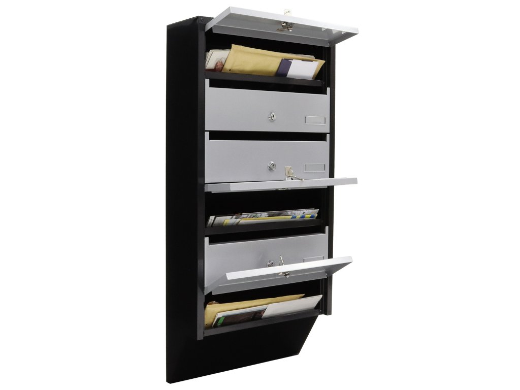 Hlavní výhody: 6 samostatných přihrádek Cylindrický zámek s 2 klíči pro každou přihrádku Kvalitní ocel tloušťky 0,8 mm Samostatné jmenovky Přední otvor pro poštu Poštovní schránka s modelovým označením Depot 6 disponuje celkem 6 samostatnými přihrádkami, které jsou určeny pro příjem pošty. Každý přihrádku lze samostatně uzamknout. Přihrádka má klasický cylindrický zámek a ke každé přihrádce se dodávají 2 klíče. Jednotlivé přihrádky mají samostatné jmenovky a dostatečně velké přední dvířka na výběr doručené pošty. Poštovní schránka Depot 6 je vhodná pro bytové domy, polyfunkční objekty atd. Na zadní straně jsou připraveny otvory pro upevnění. Materiál k upevnění je součástí balení.Doplňkové parametry