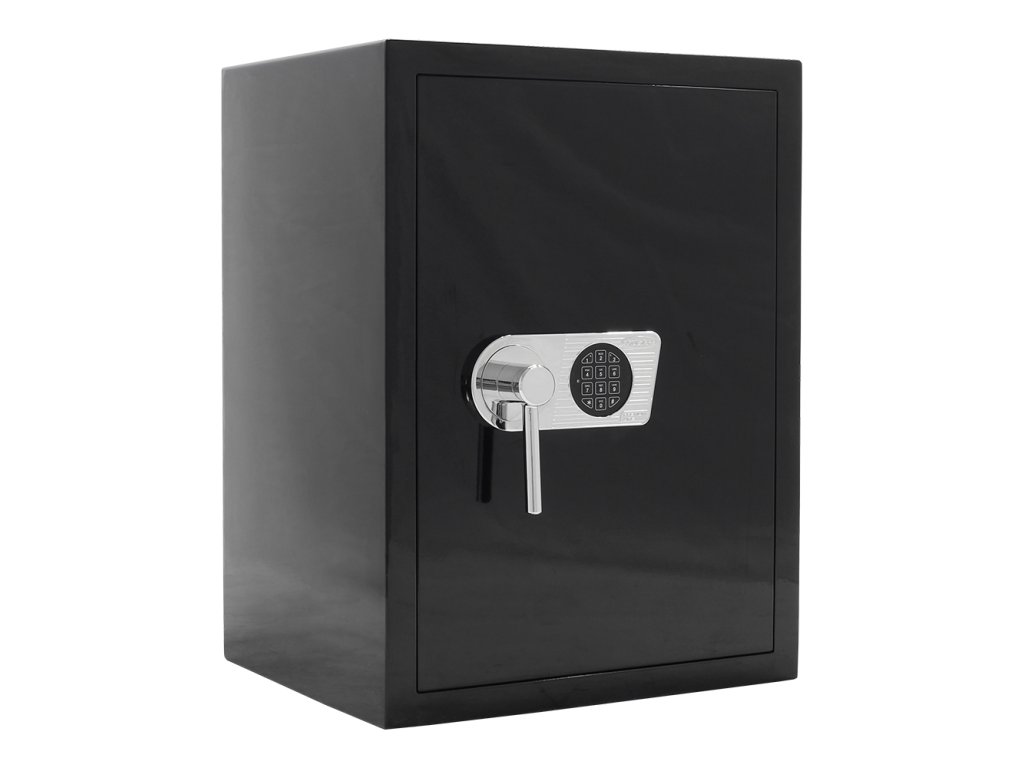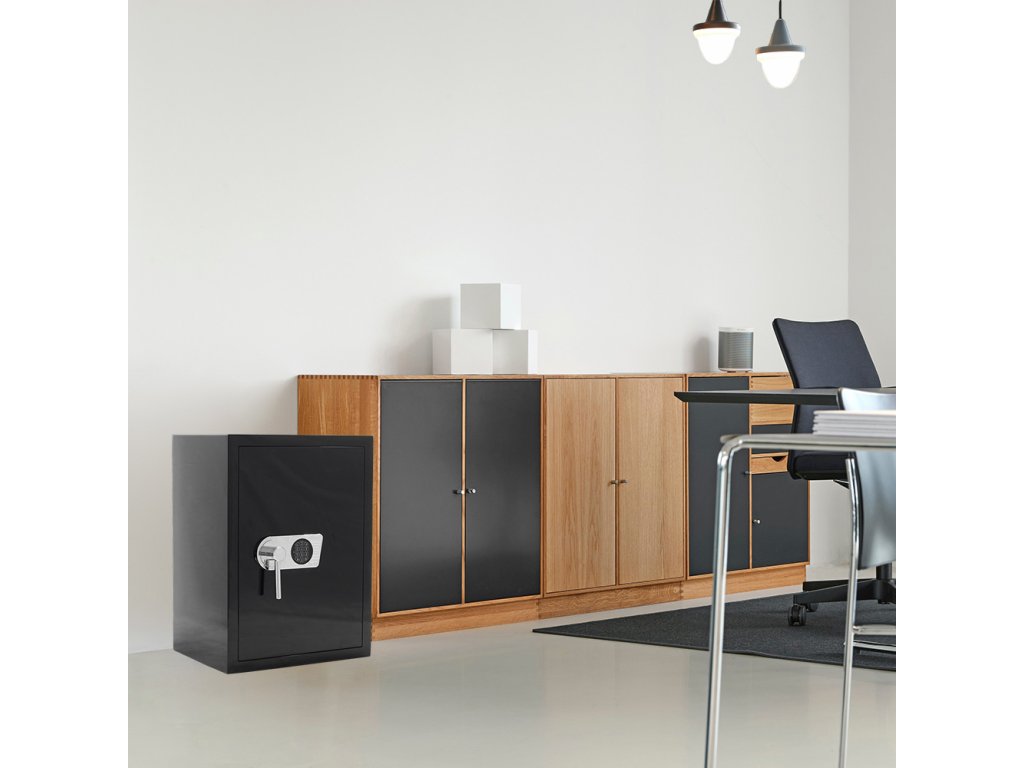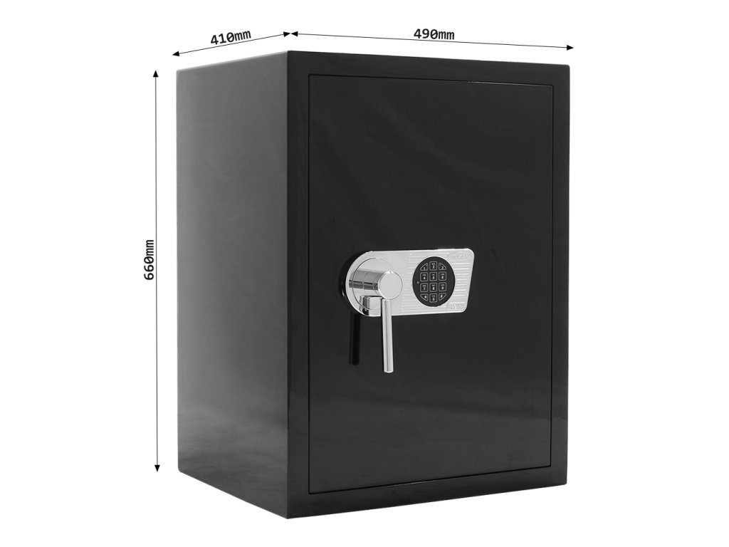 Hlavní výhody: Certifikovaný elektronický zámek Bezpečnostní třída I (ČSN EN 1143-1) Možnost úschovy i zbraní a munice podle č. 190/2003 Sb. z. Napájení 1 x 9V baterií (není součástí balení) Víceplášťové trezor 3-stranný uzamykací mechanizmus Vnitřní schránka s cylindrickým zámkem a 2 klíči Polička uvnitř Elektronické nouzové otevírání externí baterií Otvory na ukotvení na spodní straně trezoru Černý nábytkový trezor Design nabízí certifikovaný elektronický zámek s přehlednou klávesnicí. Na vnější straně se nacházejí externí kontakty na přiložení náhradní baterie. Trezor se může pyšnit bezpečnostní třídou I (ČSN EN 1143-1) a kromě klasických cenností a šperků je možné dovnitř uložit i krátké zbraně a munici. Na uložení munice se obzvlášť hodí samostatně uzamykatelná vnitřní schránka dodávaná spolu s 2 klíči. Zámek trezoru je napájen klasickou 9V baterií. Uvnitř se nachází polička pro lepší organizaci uložených věcí. Vnitřní strana trezorových dveří je z nerezové oceli. Na spodní straně trezoru jsou připraveny otvory pro ukotvení. Kotvící materiál je součástí balení. Kování zámku zvyšuje celkovou vnější hloubku trezoru o 60 mm.