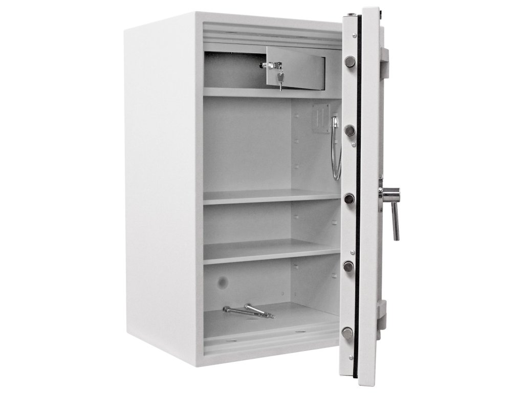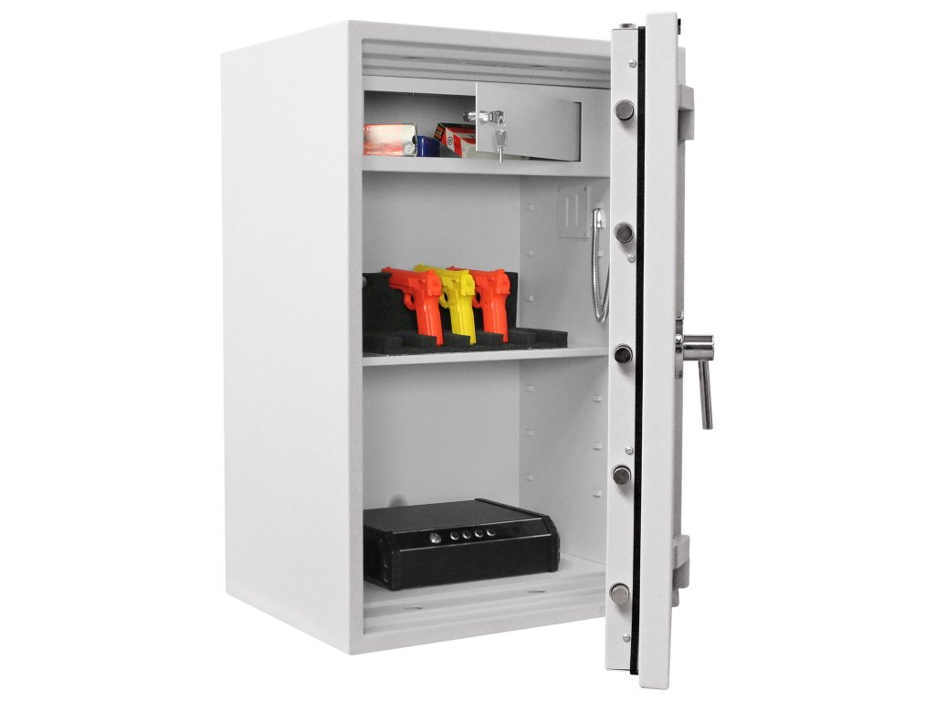 Hlavní výhody: Certifikovaný elektronický zámek Bezpečnostní třída II (ČSN EN 1143-1) Ohnivzdornost po dobu 30 minut pro papír Možnost úschovy i zbraní a munice podle č.190 / 2003 Sb. z. Napájení 1 x 9V baterií (není součástí balení) Příprava pro EMA 3-stranný uzamykací mechanizmus Vnitřní schránka s cylindrickým zámkem a 2 klíči 2 nastavitelné poličky uvnitř Otevření dveří až do 180° Možnost doobjednání teleskopické zásuvky Možnost doobjednání teleskopické poličky Možnost doobjednání teleskopické registratury Otvory na ukotvení na spodní straně trezoru Šedý nábytkový trezor nabízí bezpečné uložení cenností, šperků, cestovních dokladů, šanonů nebo dokumentů. Kromě zmíněných věcí je možné uložit i krátké zbraně a munici. Trezor disponuje elektronickým zámkem napájeným klasickou 9V baterií a bezpečnostní třídou II (ČSN EN 1143-1). Munici můžete uložit například i do samostatně uzamykatelné vnitřní schránky. Vnitřek trezoru můžete upravit podle svých požadavků a to pomocí 2 nastavitelných poliček. Potěší příprava pro EMA a možnost doobejednania doplňkové výbavy. Trezor má připravené otvory k ukotvení na spodní straně. Kotvící materiál je součástí balení. Kování zámku zvyšuje celkovou vnější hloubku trezoru o 60 mm.