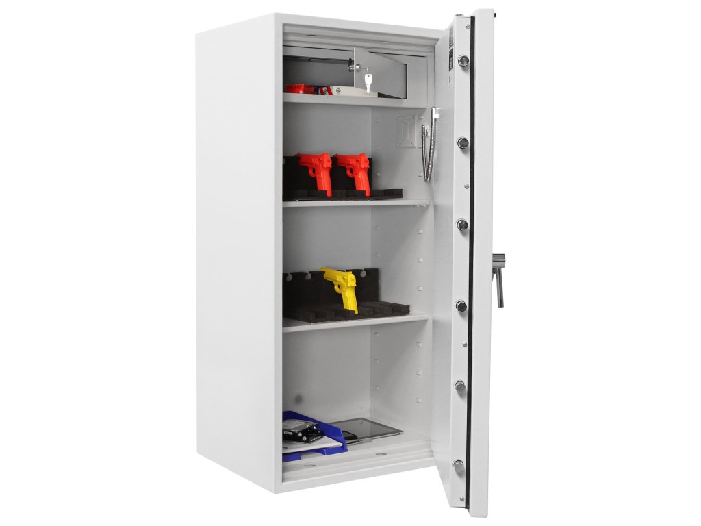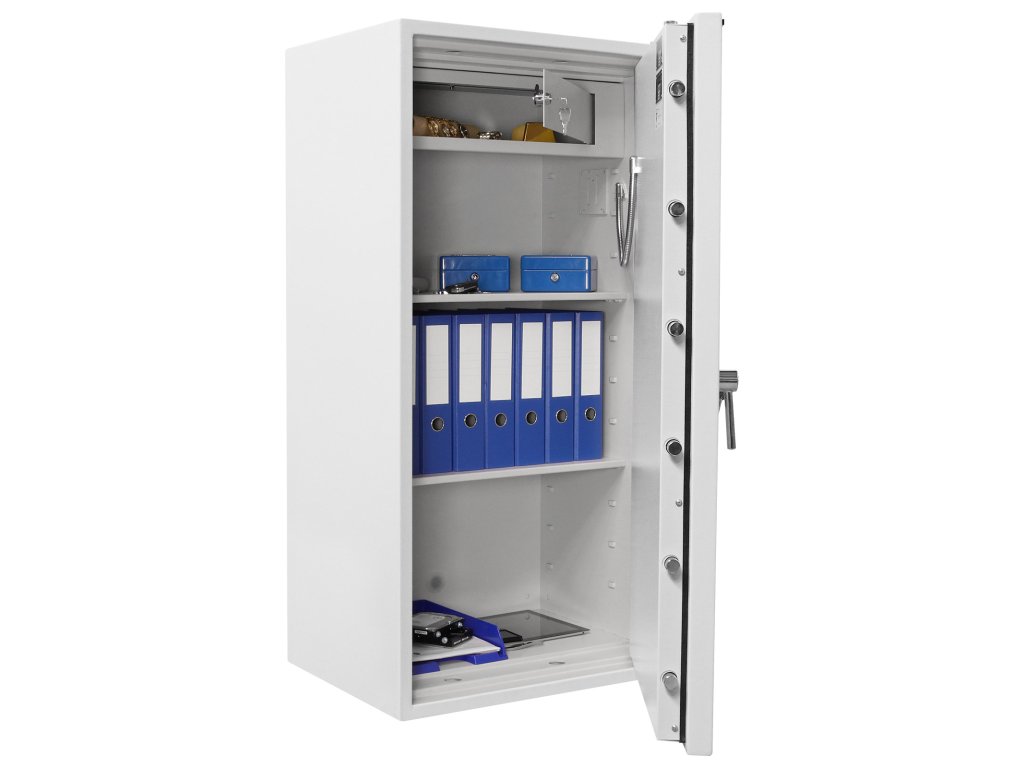 Hlavní výhody: Certifikovaný trezorový zámek Bezpečnostní třída II (ČSN EN 1143-1) Ohnivzdornost po dobu 30 minut pro papír Možnost úschovy i zbraní a munice podle č.190 / 2003 Sb. z. Příprava pro EMA 3-stranný uzamykací mechanizmus Vnitřní schránka s cylindrickým zámkem a 2 klíči 3 nastavitelné poličky uvnitř Otevření dveří až do 180 ° Možnost doobjednání teleskopické zásuvky Možnost doobjednání teleskopické poličky Možnost doobjednání teleskopické registratury Otvory na ukotvení na spodní straně trezoru Šedý nábytkový ohnivzdorný trezor ochrání nejen proti nechtěnému odcizení uložených věcí ale i před působením ohně. Trezor Rottner Diamant Fire Premium PO130 IT má certifikovaný trezorový zámek dodávaný spolu s 2 klíči. Disponuje i certifikátem bezpečnostní třídy II (ČSN EN 1143-1) a vydrží působení ohně díky ohnivzdornosti po dobu 30 minut pro papírové dokumenty. Kromě běžných věcí a cenností můžete v trezoru uschovat i krátké zbraně a munici. Trezor má přípravu pro EMA a vnitřní schránku se samostatným zamykáním doplněnou 3 poličkami uvnitř. Dveře lze otevřít do úhlu 180° a uzamkýnajú se 3-stranným uzamykacím mechanismem. V případě potřeby je možné k trezoru doobjednat doplňkovou výbavu. Spodní strana má připravené otvory pro ukotvení. Kotvící materiál je součástí balení. Kování zámku zvyšuje celkovou vnější hloubku trezoru o 60 mm.