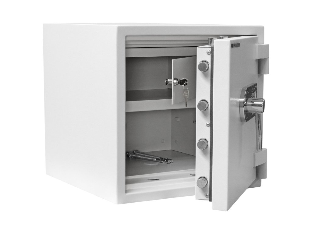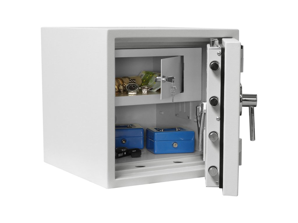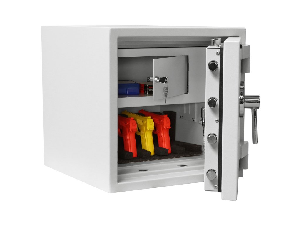 Hlavní výhody: Certifikovaný elektronický zámek Bezpečnostní třída II (ČSN EN 1143-1) Ohnivzdornost po dobu 30 minut pro papír Možnost úschovy i zbraní a střeliva podle č.190 / 2003 Sb. z. Příprava pro EMA 3-stranný uzamykací mechanizmus Napájení 1 x 9V baterií (není součástí balení) Vnitřní schránka Nastavitelná polička uvnitř Otevření dveří až do 180 ° Možnost doobjednání teleskopické zásuvky Možnost doobjednání teleskopické poličky Možnost doobjednání teleskopické registratury Elektronické nouzové otevírání externí baterií Otvory na ukotvení na spodní a zadní straně trezoru Nejmenší model nábytkového sejfu z modelové řady Diamant Fire Premium nabízí kvalitní zpracování a bezpečný prostor pro vaše důležité věci. Certifikovaný elektronický zámek je napájen klasickou 9V baterií a disponuje vnějšími kontakty pro případ vybití baterie. Trezor se může pochlubit bezpečnostní třídou II (ČSN EN 1143-1) a ohnivzdorností po dobu 30 minut. Kromě cenností, šperků a cestovních dokladů je možné uschovat i krátké zbraně a munici. Dveře o tloušťce 125 mm je možné otevřít až do úhlu 180°, přičemž po zadání hesla se dveře uzavřou bezpečným 3-stranným uzamykacím mechanismem. Uvnitř najdete vnitřní schránku a nastavitelnou poličku. Výhodou je příprava pro EMA. K trezoru je možné doobejdnať doplňkové vybavení. Trezor má připravený otvor na ukotvení na spodní a zadní straně. Kotvící materiál je součástí balení. Kování zámku zvyšuje celkovou vnější hloubku trezoru o 60 mm.