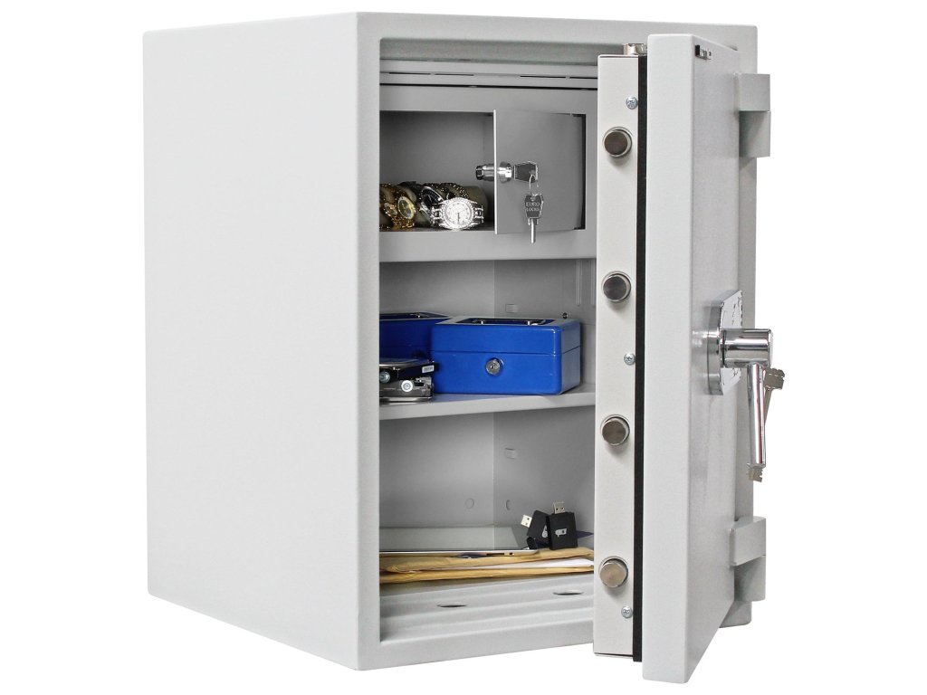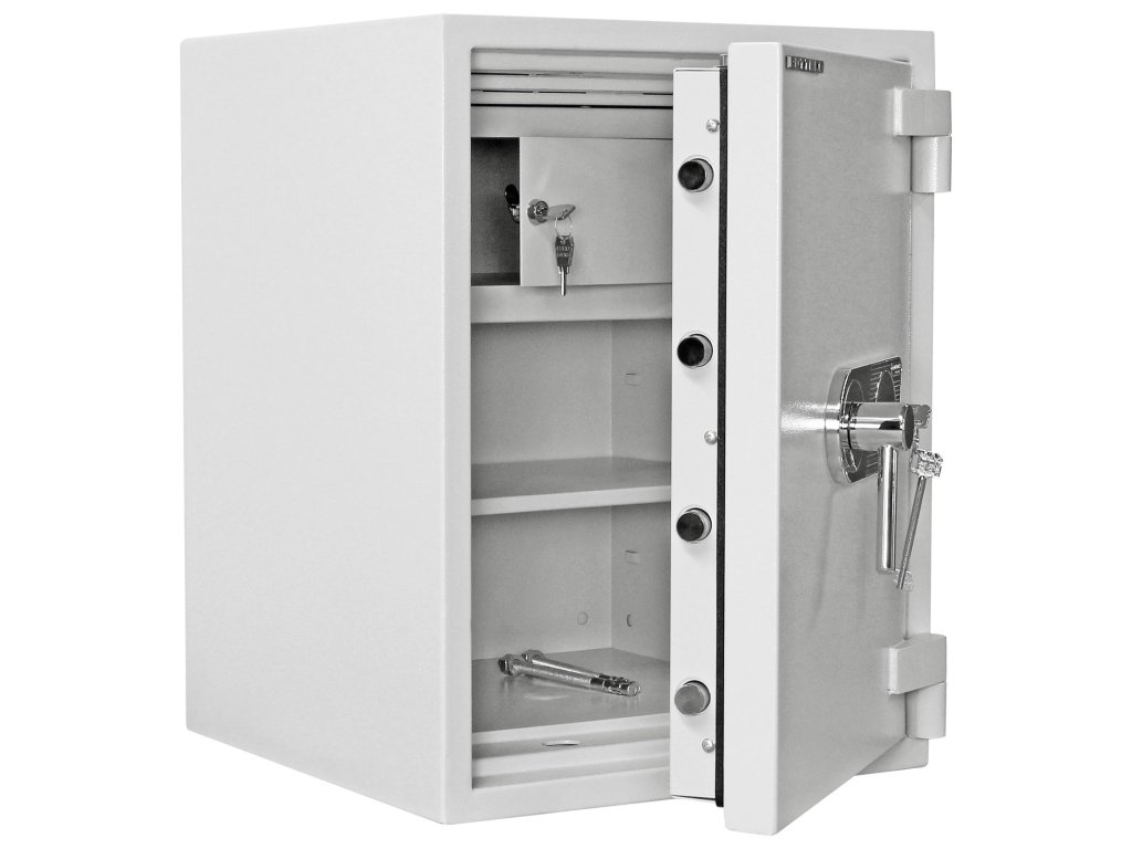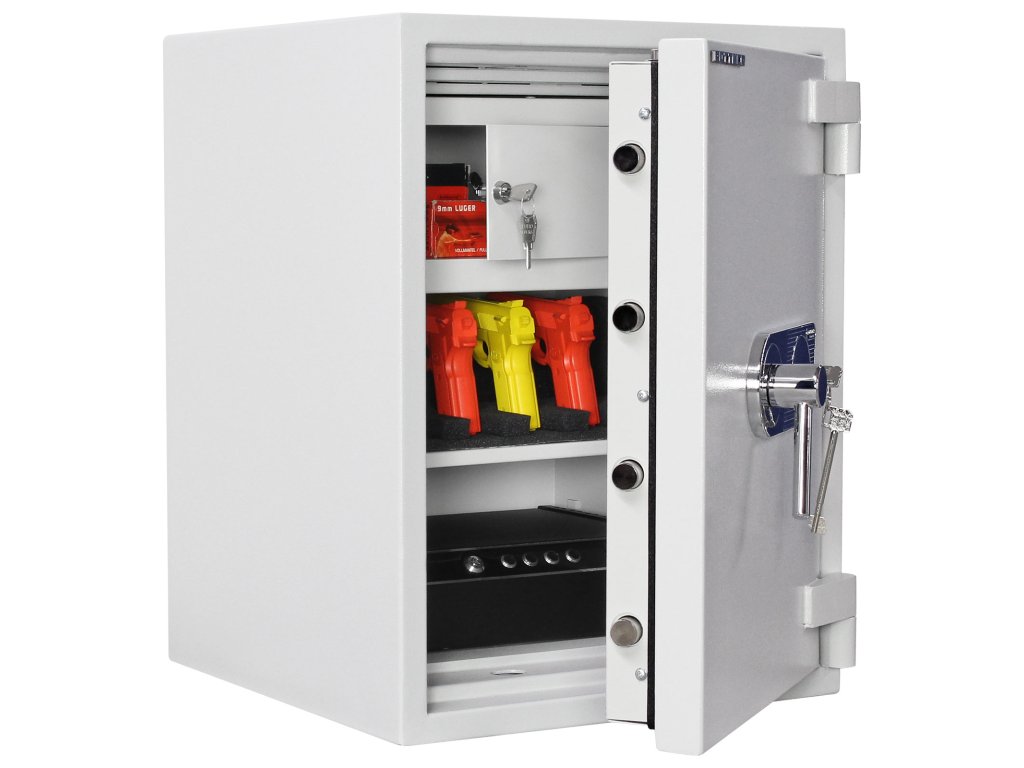 Hlavní výhody: Certifikovaný trezorový zámek Bezpečnostní třída II (ČSN EN 1143-1) Ohnivzdornost po dobu 30 minut pro papír Možnost úschovy i zbraní a střeliva podle č.190 / 2003 Sb. z. Příprava pro EMA 3-stranný uzamykací mechanizmus Vnitřní schránka Nastavitelná polička uvnitř Otevření dveří až do 180 ° Možnost doobjednání teleskopické zásuvky Možnost doobjednání teleskopické poličky Možnost doobjednání teleskopické registratury Otvory na ukotvení na spodní straně trezoru Nábytkový trezor Diamant Fire Premium PO65 nabízí bezpečné uložení cenností, šperků ale i menších dokumentů nebo šanonů. Disponuje certifikovaným trezorovým zámkem a bezpečnostní třídou II (ČSN EN 1143-1). Provedení trezoru je ohnivzdorné, přičemž odolá ohni až po dobu 30 minut. Kromě zmíněných cenností, šanonů a dokumentů je možné uložit i krátké zbraně a munici. Výhodou trezoru je příprava pro EMA. Uvnitř se nachází uzamykatelná vnitřní schránka a polička. Pohodlný přístup k uloženým věcem zajistí trezorové dveře, které lze otevřít až do 180°. Trezor je možné dodat spolu s doplňkovou výbavou. Na spodní straně se nacházejí otvory pro ukotvení. Kotvící materiál je součástí balení. Kování zámku zvyšuje celkovou vnější hloubku trezoru o 60 mm.