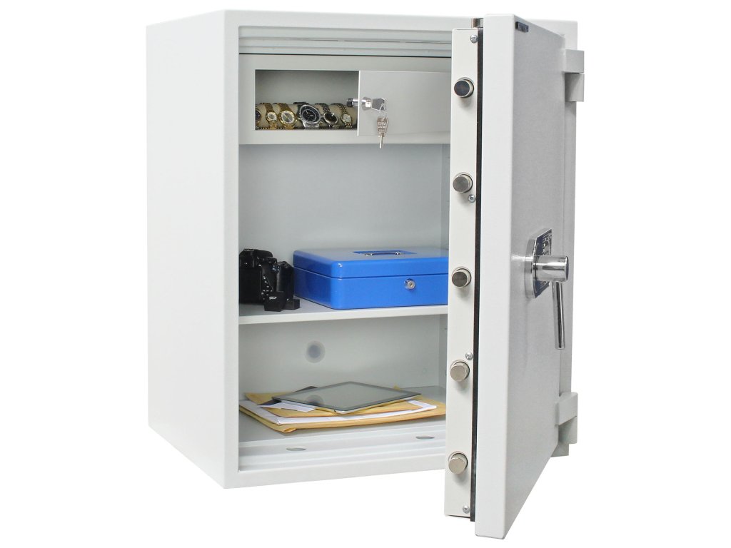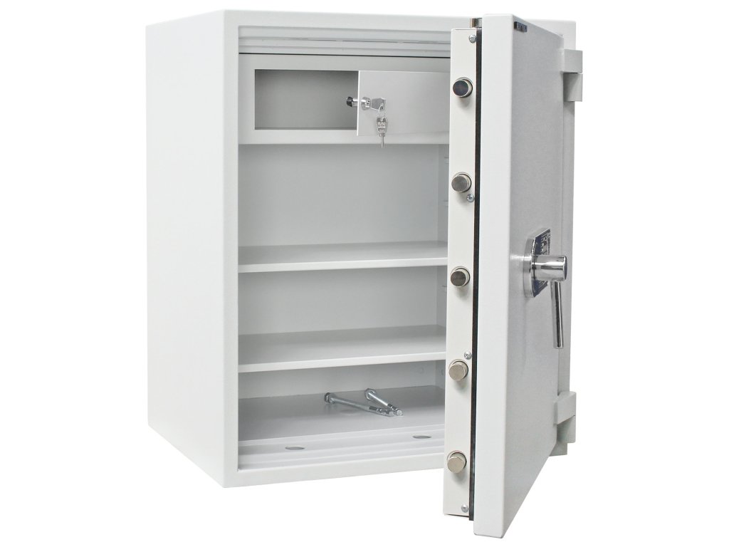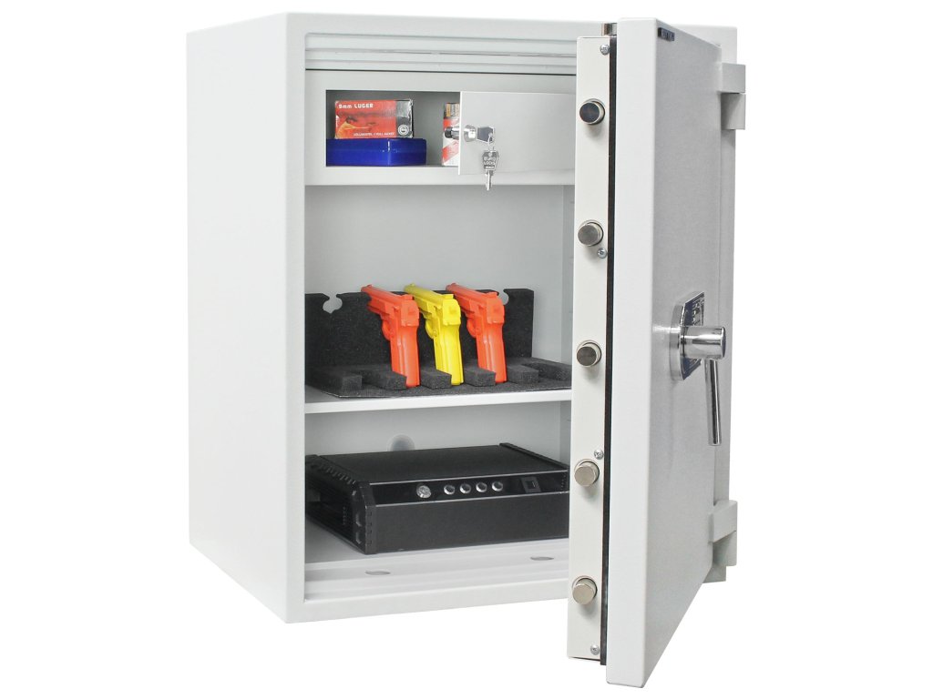 Hlavní výhody: Certifikovaný elektronický zámek Bezpečnostní třída II (ČSN EN 1143-1) Ohnivzdornost po dobu 30 minut pro papír Možnost úschovy i zbraní a střeliva podle č.190 / 2003 Sb. z. Napájení 1 x 9V baterií (není součástí balení) Příprava pro EMA 3-stranný uzamykací mechanizmus Vnitřní schránka 2 poličky uvnitř Otevření dveří až do 180 ° Možnost doobjednání teleskopické zásuvky Možnost doobjednání teleskopické poličky Možnost doobjednání teleskopické registratury Elektronické nouzové otevírání externí baterií Otvory na ukotvení na spodní straně trezoru Šedý nábytkový trezor z modelové řady Diamant Fire Premium disponuje certifikovaným elektronickým zámkem s možností elektronického nouzového otevírání přiložením externí baterie. Trezor má certifikát bezpečnostní třídy II (ČSN EN 1143-1) a ohnivzdornost a to až po dobu 30 minut pro papírové dokumenty. Kromě klasických cenností, šperků, šanonů a jiných dokumentů můžete v trezoru uložit i krátké zbraně a munici. Přehledná a snadno čitelná klávesnice a zámek jsou napájeny klasickou 9V baterií. Výhodou je příprava pro EMA. Uvnitř trezoru se nachází vnitřní schránka a 2 poličky. Spodní strana trezoru má připravené otvory pro ukotvení. Kotvící materiál je součástí balení. Kování zámku zvyšuje celkovou vnější hloubku trezoru o 60 mm.