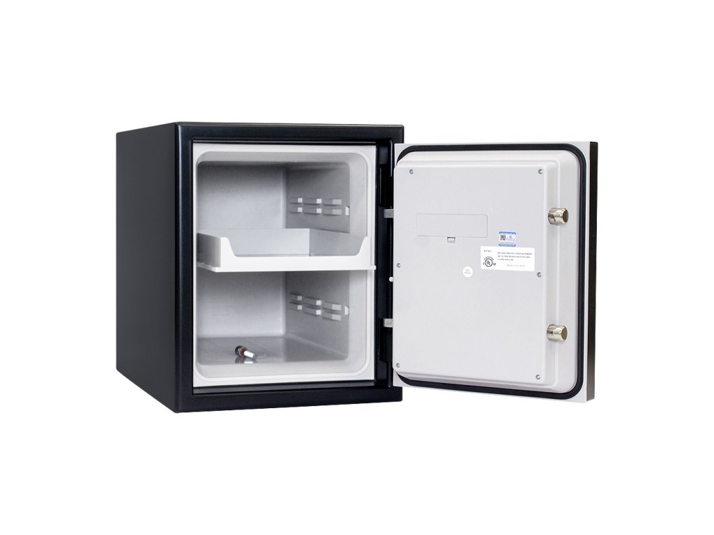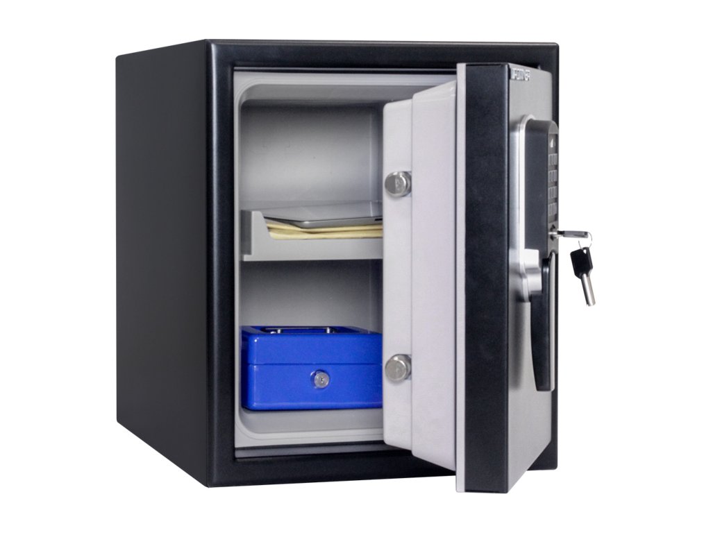 Hlavní výhody: Elektronický zámek Ohnivzdornost po dobu 120 minut pro papír Napájení 4 x 1,5V AA bateriemi (nejsou současti balení) Nastavitelná polička uvnitř 4-stranný uzamykací mechanizmus Otevření dveří až do 90° Mechanické nouzové otevírání s cylindrickým zámkem a 2 klíči Otvory na ukotvení na spodní straně sejfu Černý elektronický sejf z modelové řady Fire Data disponuje elektronickým zámkem. Sejf Fire Data 40 je ohnivzdorný, a to až po dobu 120 minut pro papírové dokumenty. Zámek spolu s přehlednou klávesnicí jsou napájeny klasickými 1,5V AA bateriemi. Dveře sejfu lze otevřít do úhlu 90° a mají 4-stranný uzamykací mechanismus. Uvnitř sejfu se nachází výškově nastavitelná polička. Zámek sejfu je vybaven i mechanickým nouzovým otevíráním. Na spodní straně sejfu jsou připraveny otvory pro ukotvení. Kotvící materiál je součástí balení. Kování zámku zvyšuje celkovou vnější hloubku sejfu o 25 mm.