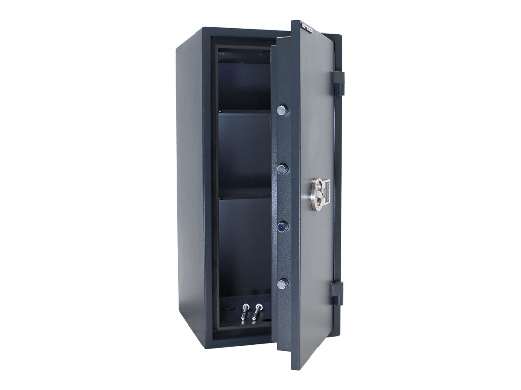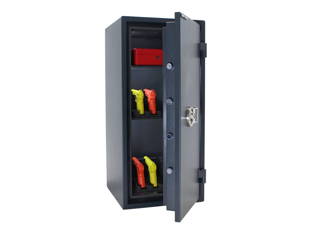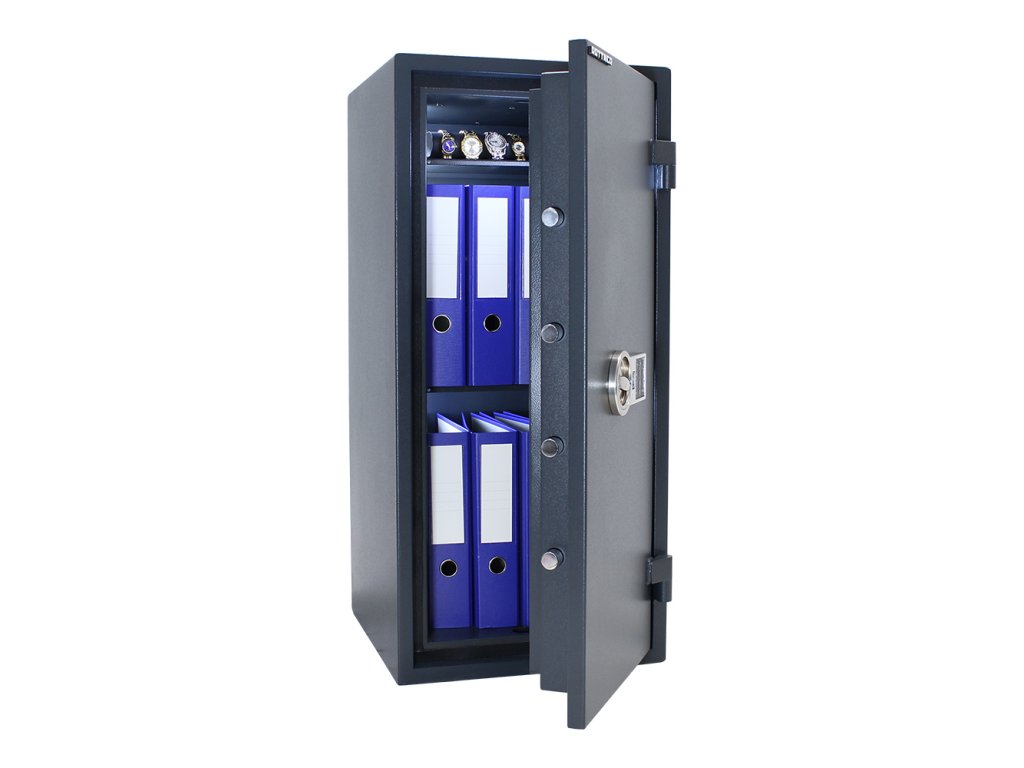 Hlavní výhody: Certifikovaný elektronický zámek Bezpečnostní třída I (ČSN EN 1143-1) Ohnivzdornost po dobu 30 minut pro papír Napájení 1 x 9V baterií (není součástí balení) 3-stranný uzamykací mechanizmus Korpus tloušťky 56 mm a dveře tloušťky 95 mm Nastavitelná polička uvnitř Otevření dveří až do 180° Otvory na ukotvení na spodní straně trezoru Antracitový trezor Fire Hero 100 EL disponuje certifikovaným elektronickým zámkem a bezpečnostní třídou I (ČSN EN 1143-1). Klávesnice pro zadávání kódu a zámek jsou napájeny klasickou 9V baterií. V případě jejího vybití je připraveno nouzové elektronické otevírání přiložením náhradní baterie na vnější kontakty. Výhodou trezoru je ohnivzdornost, a to až po dobu 30 minut pro papírové dokumenty. Korpus trezoru má tloušťku 56 mm, přičemž dveřní plášť je hrubý 95 mm. Dveře za uzamykají 3-stranným uzamykacím mechanismem. Uvnitř, pro lepší předělení prostoru, se nachází nastavitelná polička. Spodní strana trezoru má připravené otvory pro ukotvení. Kotvící materiál je součástí balení. Kování zvyšuje celkovou vnější hloubku trezoru o 15 mm.
