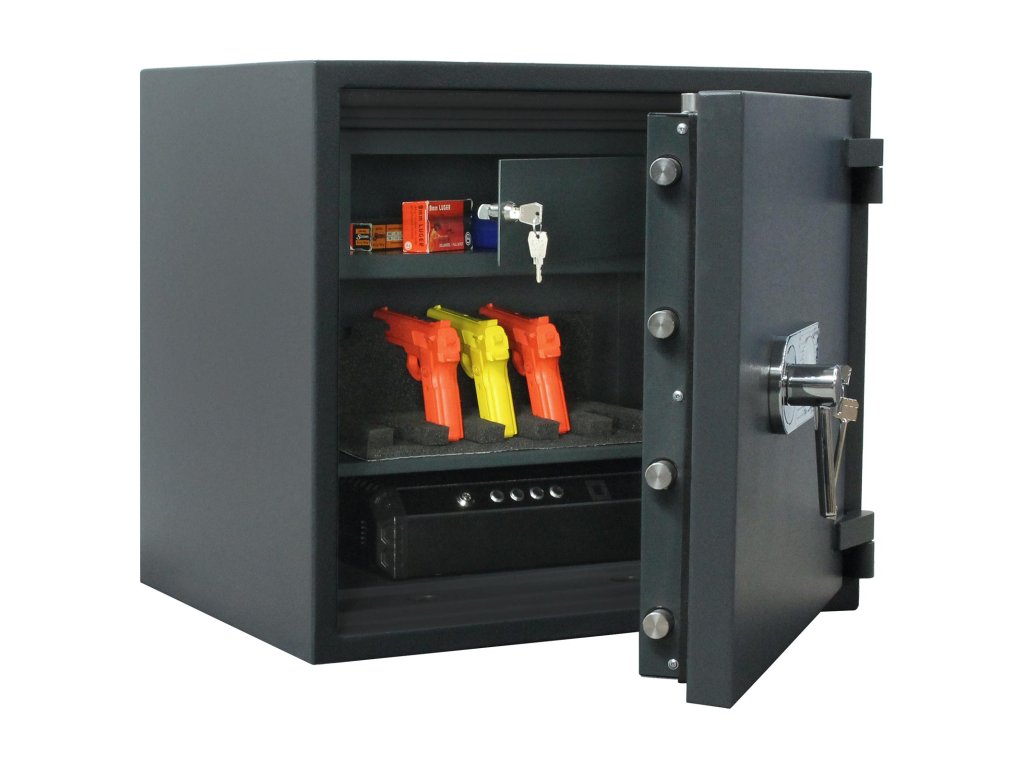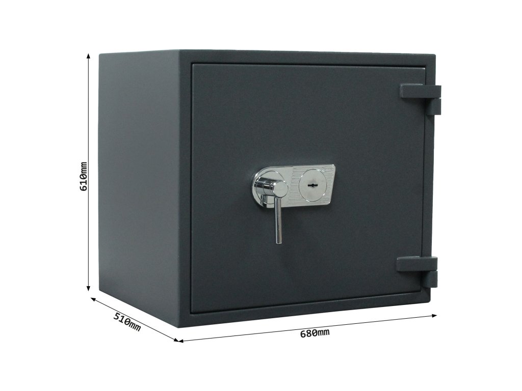 Hlavní výhody: Certifikovaný trezorový zámek Bezpečnostní třída II (ČSN EN 1143-1) Ohnivzdornost po dobu 30 minut pro papír Možnost úschovy i zbraní a munice podle č. 190/2003 Sb. z. 3-stranný uzamykací mechanizmus Vnitřní schránka s cylindrickým zámkem a 2 klíči Nastavitelná polička uvnitř Otevření dveří až do 180° Možnost doobjednání teleskopické police Možnost doobjednání teleskopické registratury Otvory na ukotvení na spodní straně trezoru Ohnivzdorný trezor Galaxy 60 nabízí certifikovaný trezorový zámek spolu s bezpečnostní třídou II (ČSN EN 1143-1). Trezor vydrží v případě požáru až 30 minut bez poškození uloženého obsahu. Kromě klasických věcí můžete v trezoru uložit i krátké zbraně a munice. Dveře trezoru je možné otevřít až do úhlu 180° a po otočení klíčem se uzamknou na 3 stranách. Uvnitř trezoru se kromě nastavitelné poličky nachází i samostatně uzamykatelná vnitřní schránka s cylindrickým zámkem. Výhodou je možnost doobjednat doplňkovou výbavu. Na spodní straně trezoru jsou připraveny otvory pro ukotvení. Kotvící materiál je součástí balení. Kování zvyšuje celkovou vnější hloubku trezoru o 60 mm.