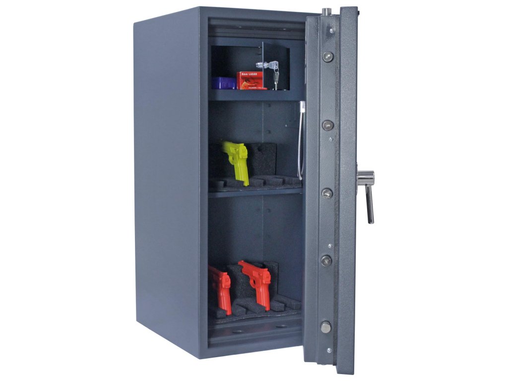 Hlavní výhody: Certifikovaný elektronický zámek Bezpečnostní třída III (ČSN EN 1143-1) Ohnivzdornost po dobu 30 minut pro papír 3-stranný uzamykací mechanizmus Napájení 1 x 9V baterií (není součástí balení) Vnitřní schránka s cylindrickým zámkem a 2 klíči 2 nastavitelné poličky Příprava pro EMA Otevření dveří až do 180° Možné doobjednání teleskopické police Možné doobjednání teleskopické registratury Elektronické nouzové otevírání externí baterií Otvory na ukotvení na spodní a zadní straně trezoru Certifikovaný nábytkový trezor Imperial nabízí certifikovaný elektronický zámek. Napájen klasickou 9V baterií. Trezor má osvědčení o bezpečnostní třídě III (ČSN EN 1143-1) a ohnivzdornost až po dobu 30 minut. Dveře trezoru po zadání kódu se uzavřou 3-stranným uzamykacím mechanismem. Trezor má přípravu pro EMA. Dveře lze otevřít až do úhlu 180°. Po otevření dveří uvnitř najdete 2 nastavitelné poličky a samostatně uzamykatelnou skříňku s 2 klíči. Výhodou trezoru Imperial je i možnost doobjednat doplňkové vybavení. Trezor tak bude splňovat vaše požadavky do posledního puntíku. Na spodní a zadní straně trezoru jsou připravené otvory pro ukotvení. Kotvící materiál je součástí balení. Kování zámku zvyšuje celkovou vnější hloubku trezoru o 60 mm.