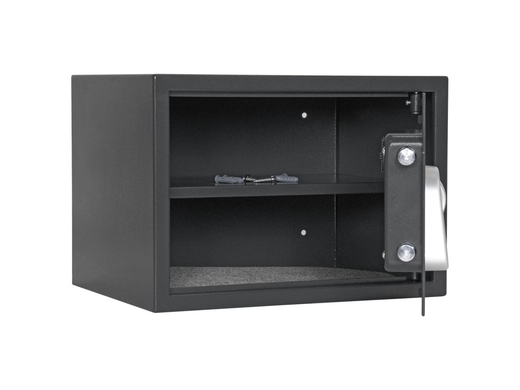 Hlavní výhody: Elektronický zámek Napájení 4 x 1,5V AA bateriemi (nejsou součástí balení) Jednoplášťový sejf 1 police vyjímatelní Nouzové mechanické otevírání Otvory pro ukotvení na spodní i zadní straně trezoru Nábytkový sejf z modelové řady Jupiter má elektronický zámek s napájením 4 x 1,5V bateriemi (nejsou součástí balení). Uvnitř sejfu najdou své místo malé cennosti, doklady, hodinky nebo menší šperky. Sejf lze ukotvit prostřednictvím připravených otvorů na spodní i zadní straně. Materiál pro ukotvení je součástí balení. Pro tuto schránku na zbraně je stanoveno, že při přechovávání krátkých zbraní do počtu 2 ks nebo do 500 ks nábojů plati prohlášení o shodě.Doplňkové parametry