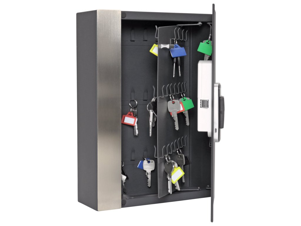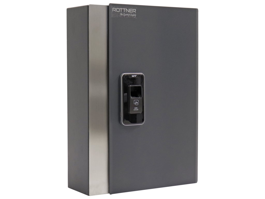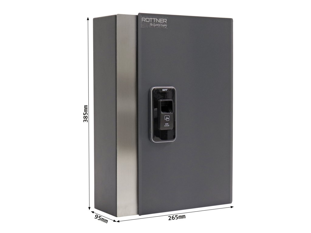 Hlavní výhody: Zámek na otisk prstu 2 hlavních a 8 uživatelských otisků Napájení 4 x 1,5V bateriemi (nejsou součástí balení) Celkově 68 háčků Jednoplášťový korpus Pevný umístěna lišta s háčkem Pozinkovaný korpus Moderní skříňka na klíče Key Pro 68 disponuje zámkem na otisk prstu. Už si nemusíte pamatovat žádný kód nebo mít u sebe klíče, postačí pouze správný otisk prstu a skříňka se odemkne. Celkově je možné uložit 2 hlavních (master) a až 8 uživatelských (user) otisků. Zámek spolu se snímačok otisku prstu jsou napájeny 4 x 1,5V bateriemi, které nejsou součástí balení. Uvnitř skříňky se nacházejí fixně umístěny lišty, na kterých je celkově 68 pozinkovaných háčků. Dveře skříňky lze otevřít do úhlu 90° a otvory na zadní straně slouží pro upevnění např. na stěnu. Materiál na upevnění je součástí balení.