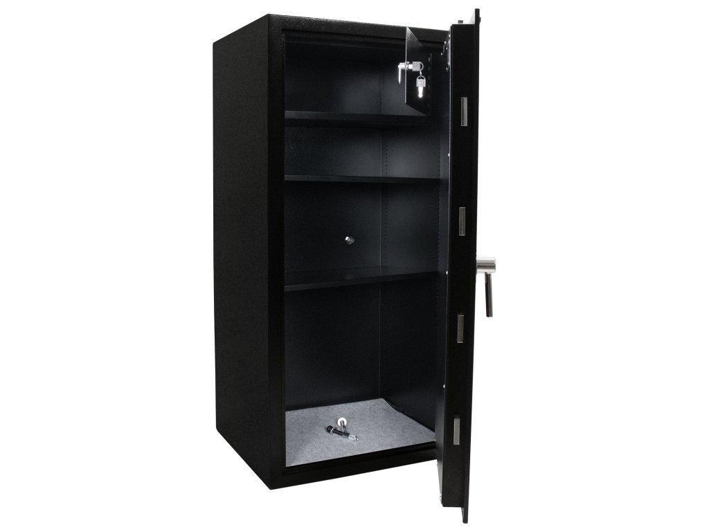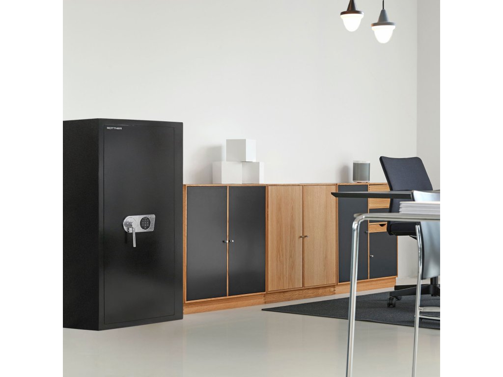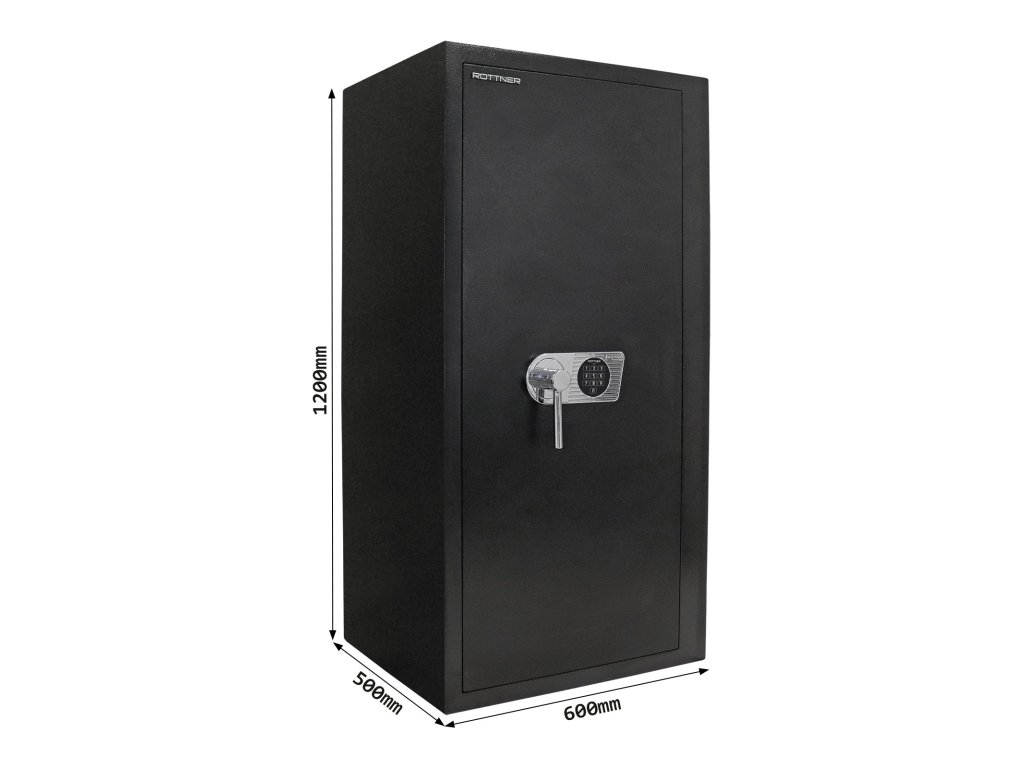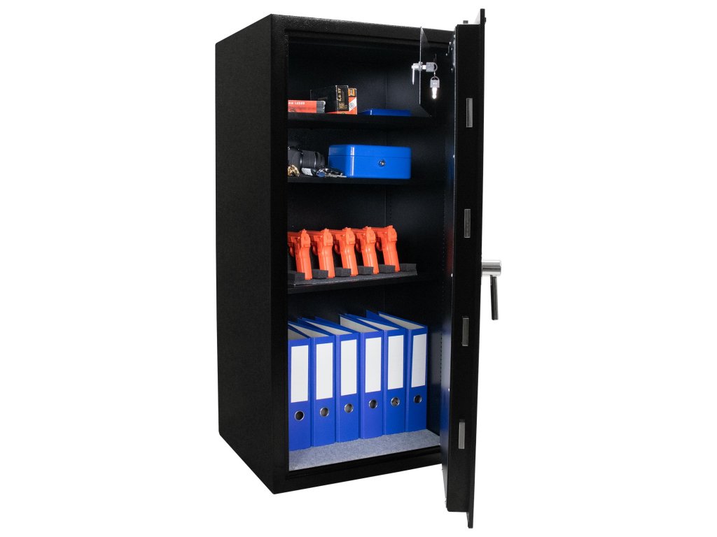 Hlavní výhody: Certifikovaný elektronický zámek Bezpečnostní třída I (ČSN EN 1143-1) Možnost úschovy i zbraní a munice podle č. 190/2003 Sb. z. Napájení 1 x 9V baterií (není součástí balení) Dvouplášťový trezor 3-stranný uzamykací mechanizmus Vnitřní schránka s cylindrickým zámkem a 2 klíči 2 poličky uvnitř Elektronické nouzové otevírání externí baterií Otvory na ukotvení na spodní a zadní straně trezoru Černý nábytkový trezor ve stylové černé barvě nabízí certifikovaný elektornický zámek napájen klasickou 9V baterií. Trezor má bezpečnostní třídu I (ČSN EN 1143-1) a kromě cenností, cestovních dokladů, šperků, šanonů nebo menších pokladniček můžete v trezoru uschovat i zbraně a munici. Dvouplášťový trezor s uzamčením trezorových dveří na 3 stranách nabízí i vnitřní schránku se samostatným zamykáním. Pro lepší přizpůsobení prostoru jsou uvnitř trezoru nainstalovány 2 poličky. Na spodní a zadní straně trezoru se nacházejí připravené otvory pro ukotvení. Kotvící materiál je součástí balení. Kování zámku zvyšuje vnější hloubku trezoru o 60 mm.