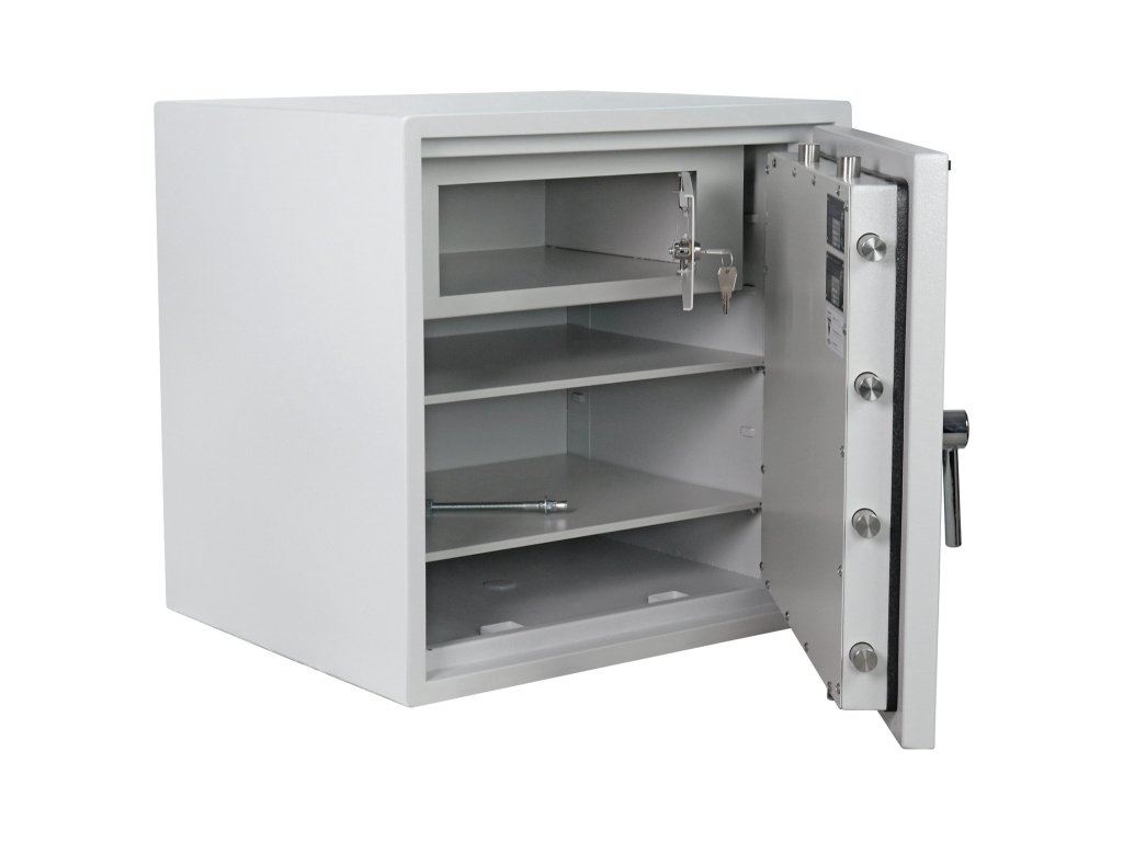 Hlavní výhody: Certifikovaný trezorový zámek Bezpečnostní třída I (ČSN EN 1143-1) Ohnivzdornost po dobu 30 minut pro papír Možnost úschovy i zbraní a munice podle č.190 / 2003 Sb. z. Dvouplášťový korpus Vyjímatelná vnitřní schránka s cylindrickým zámkem a 2 klíči 3-stranný uzamykací mechanizmus 2 poličky uvnitř Otevření dveří až do 180° Možnost doobjednání teleskopické police Možnost doobjednání teleskopické závěsné registratury Otvory na ukotvení na spodní straně trezoru Šedý nábytkový trezor Opal Fire Premium OPD 65 disponuje certifikovaným trezorovým zámkem, který je dodáván i se 2 klíči. Trezor má certifikát bezpečnostní třídy I (ČSN EN 1143-1) a je ohnivzdorný a to až po dobu 30 minut pro papírové dokumenty. Kromě šanonů, papírových dokumentů, cenností a jiných věcí je možné do trezoru uložit i krátké zbraně a munici. Trezor se prodává v provedení s dvouplášťovým korpusem a dveřmi s 3-stranným uzamykacím mechanismem a možností otevření do úhlu 180°. Výhodou trezoru OPD 65 je vyjímatelná vnitřní schránka se samostatným zamykáním. K trezoru lze doobjednat doplňkovou výbavu. Spodní strana má připravené otvory pro ukotvení. Kotvící materiál je součástí balení. Kování zámku zvyšuje celkovou vnější hloubku trezoru o 60 mm.