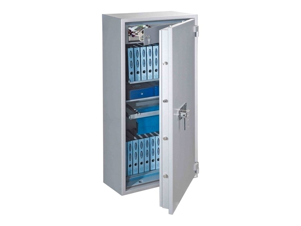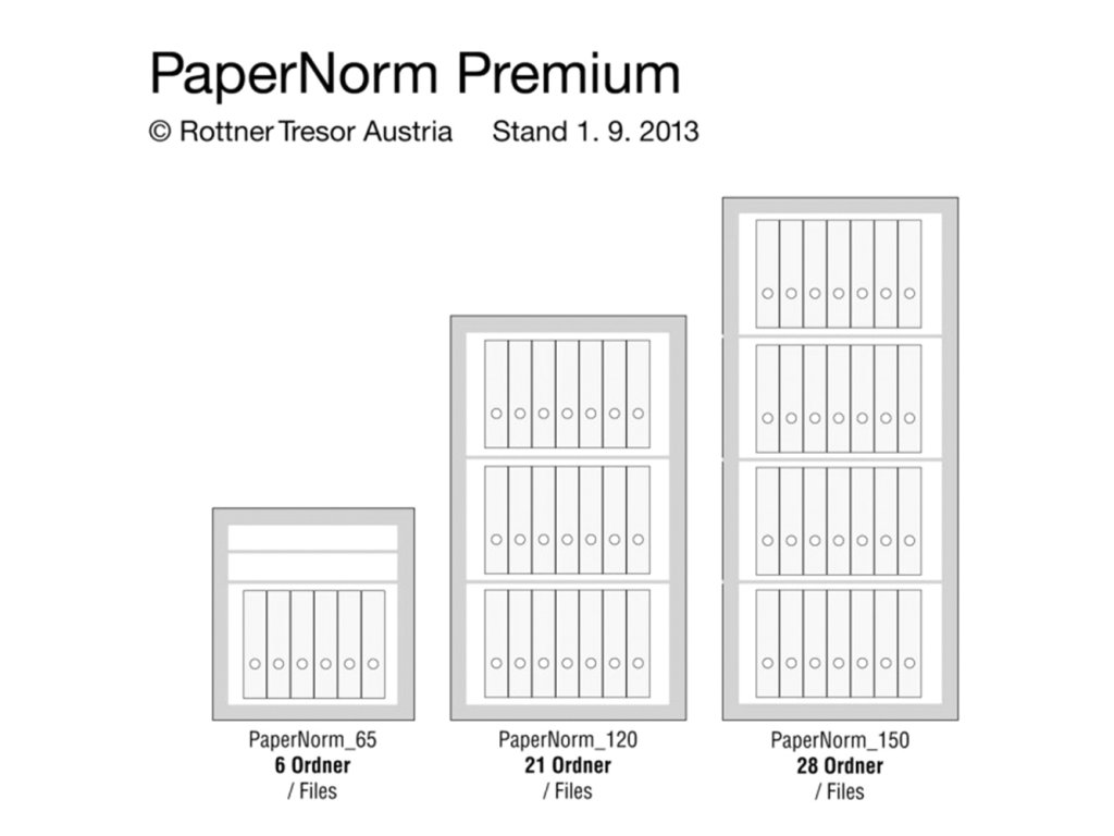 Hlavní výhody: Certifikovaný trezorový zámek Bezpečnostní třída 0 (ČSN EN 1143-1) Ohnivzdornost po dobu 60 minut pro papír 4-stranný uzamykací mechanizmus 2 poličky uvnitř Otevírání dveří až do 180° Možnost doobjednání teleskopické registratury Možnost doobjednání teleskopické police Možnost doobjednání vnitřního sejfu Otvoru na ukotvení na spodní straně trezoru Víceplášťové trezor z modelové řady Paper Norm disponuje certifikovaným trezorovým zámkem dodávaným spolu s 2 klíči. Trezor má certifikát bezpečnostní třídy 0 (ČSN EN 1143-1) a je ohnivzdorný během 60 minut pro papírové dokumenty. Dveře trezoru Paper Norm 65 lze otevřít do úhlu 180° a uzamkýnajú se 4-stranným uzamykacím mechanismem. Uvnitř trezoru se nacházejí 2 poličky. V případě potřeby je možné za doplatek dooobjednať doplňkovou výbavu. Spodní strana má připravené otvory pro ukotvení. Materiál na ukotvení je součástí balení. Kování zámku zvyšuje celkovou vnější hloubku trezoru o 60 mm.