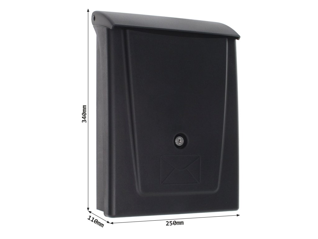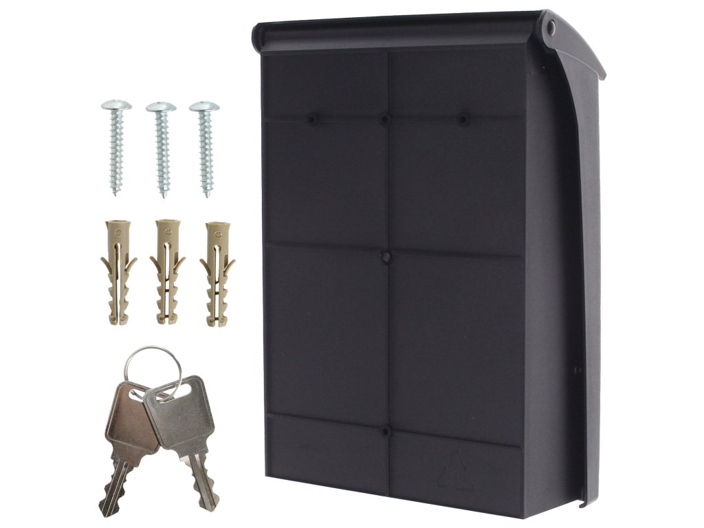 Hlavní výhody: Cylindrický zámek se 2 klíči Horní vhod pro poštu max. A4 Bez jmenovky Plastové provedení Černá plastová poštovní schránka nabízí výbornou volbu, jak zkrášlit prostředí kolem vašeho domu. Poštovní schránka má klasický cylindrický zámek dodávaný spolu s 2 klíči. Plastová schránka disponuje horním vhozem spolu s plastovou stříškou. Přes vhod lze vhodit zásilky až do velikosti A4. Doručenou poštu jednoduše vyberete přes velká dvířka, které nemají prostor na jmenovku. Na zadní straně jsou připraveny otvory an upevnění na fasádu domu, plot nebo zeď. Materiál k upevnění je součástí balení.Doplňkové parametry