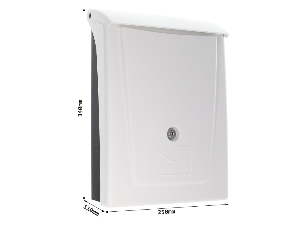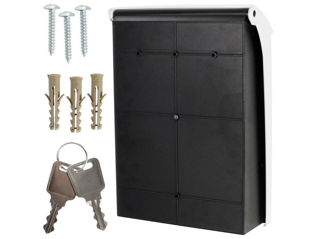 Hlavní výhody: Cylindrický zámek se 2 klíči Horní vhod pro poštu max. A4 Bez jmenovky Plastové provedení Plastová poštovní schránka Posta v dvojitém černobílém provedení. Nabízí klasický cylindrický zámek s 2 klíči. Pošta se vhazuje přes horní vhod, který je chráněn plastovou stříškou. Zabrání se tak vnikání dešťové vody a nečistot dovnitř schránky. Do schránky je možné vhodit poštu do velikosti maximálně A4. Poštovní schránka Posta nemá jmenovku a je možné ji upevnit pomocí přiloženého materiálu na upevnění.Doplňkové parametry