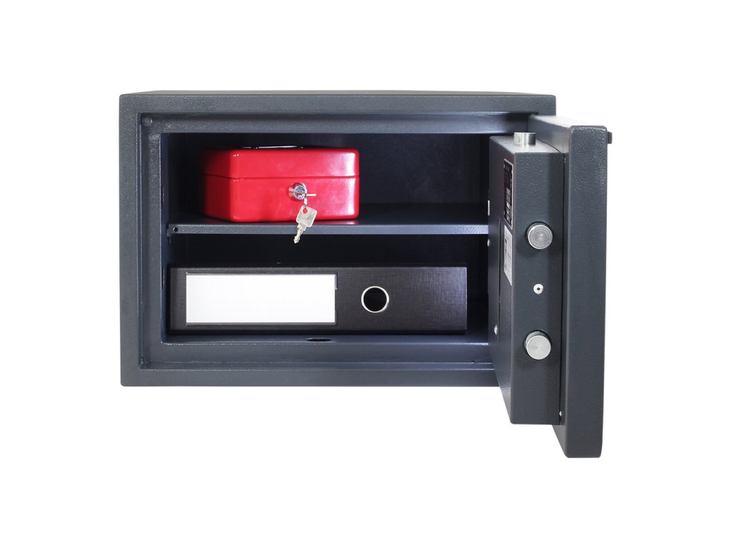 Hlavní výhody: Certifikovaný elektronický zámek Bezpečnostní třída S2 (ČSN EN 14450) Možnost úschovy aj zbraní a munice podle č. 190/2003 Sb Dvouplášťový nábytkový trezor Napájení 1 x 9V baterií (součástí balení) Tloušťka pláště dveří 70 mm Polička uvnitř Nábytkový trezor zaujme vysokou kvalitou zpracování a jednoduchým, ale vkusným designem. S certifikovaným elektronickým zámkem, který je v případě nouze možné otevřít přiložením externí baterie ke vnějším kontaktem na zámku. Postará se o všechny vaše cennosti nebo dokumenty, které v něm uložíte. Trezor má dvouplášťové provedení. Pro více variability je trezor dodáván s vestavěnou poličkou. Vnitřek trezoru je tak prakticky předělené. Ukotvíte ho jednoduše díky materiálu, který je součástí balení. Pro ukotvení na stěnu nebo podlahu jsou v trezoru připraveny otvory na spodní i zadní straně.