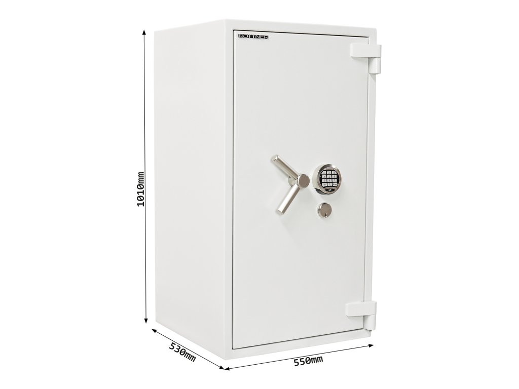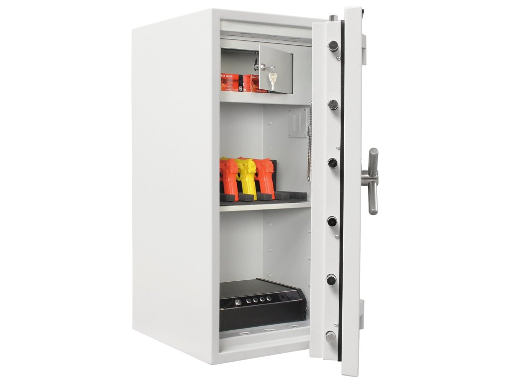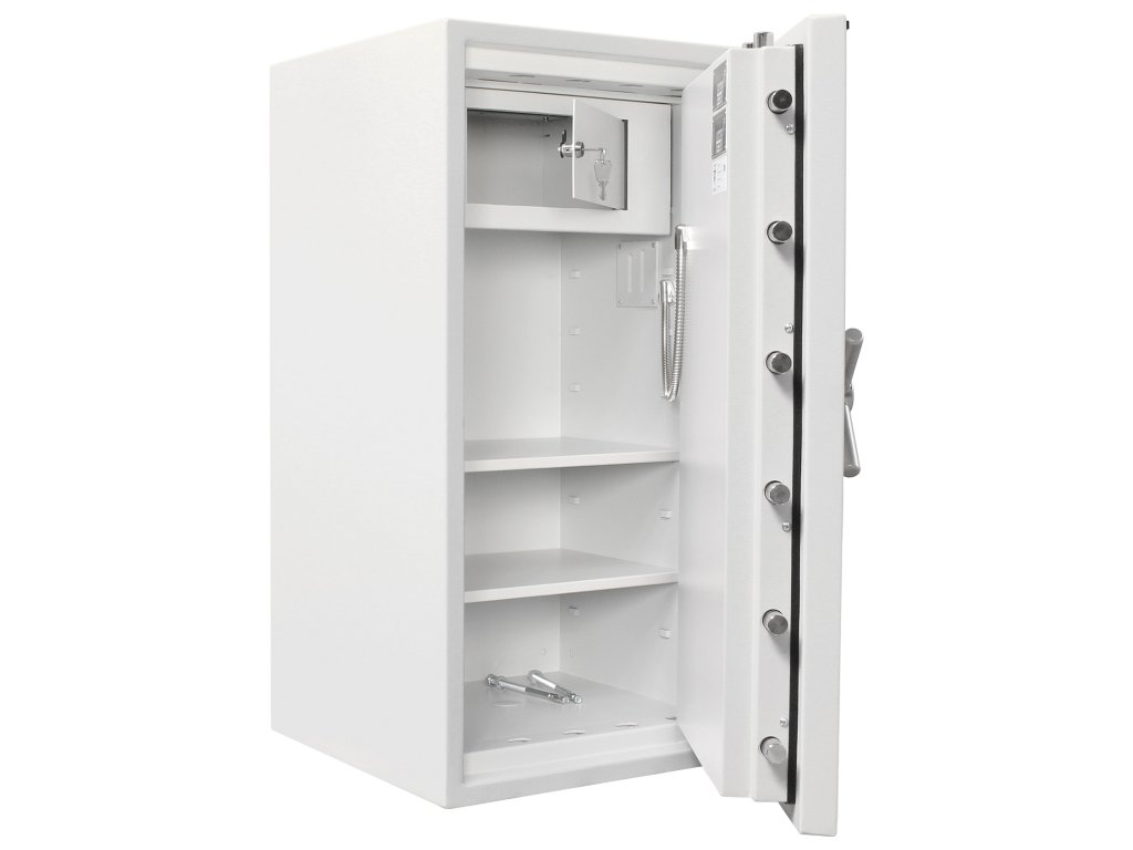 Hlavní výhody: Certifikovaný klíčový i elektronický zámek s 2 klíči Bezpečnostní třída IV (ČSN EN 1143-1) Ohnivzdornost po dobu 30 minut pro papír Napájení 1 x 9V baterií (není součástí balení) 3-stranný uzamykací mechanizmus Korpus tloušťky 45 mm a dveře tloušťky 125 mm Vnitřní schránka s cylindrickým zámkem a 2 klíči 2 poličky uvnitř Příprava pro EMA Otevření dveří až do 180 ° Možnost doobjednání teleskopické zásuvky Možnost doobjednání teleskopické police Možnost doobjednání teleskopické registratury Otvory na ukotvení na spodní a zadní straně trezoru Šedý ohnivzdorný trezor s modelovým jménem Projekt Fire Premium 100 nabízí certifikovanou kombinaci klíčového a elektronického zámku. Vysoká bezpečnostní třída IV (ČSN EN 1143-1) a odolnost proti požáru až po dobu 30 minut. Spolu s trezorem se ke klíčovému zámku dodávají 2 klíče. Elektronický zámek je napájen jednou klasickou 9V baterií. Trezor má korpus tloušťky 45 mm a dveře s tloušťkou 125 mm. Dveře mají 3-stranný uzamykací mechanismus a lze je otevřít až do úhlu 180°. Pokud nahlédneme do nitra, potěší nás vyjímatelná vnitřní skříňka, kterou lze samostatně uzamknout a 2 poličky. Trezor má přípravu pro EMA. Výhodou je možnost doobjednání doplňkové výbavy. Spodní a zadní strana trezoru má předpřipravené otvory pro ukotvení. Kotvící materiál je součástí dodávky. Kování zámku zvyšuje celkovou vnější hloubku trezoru o 60 mm.