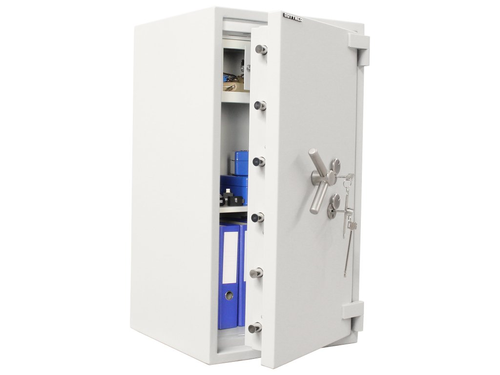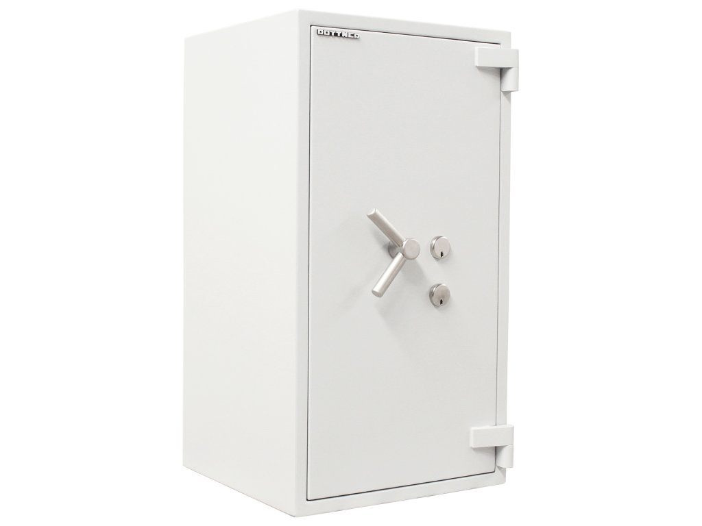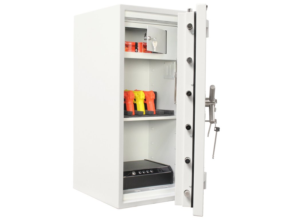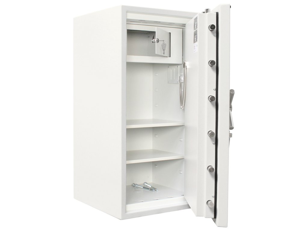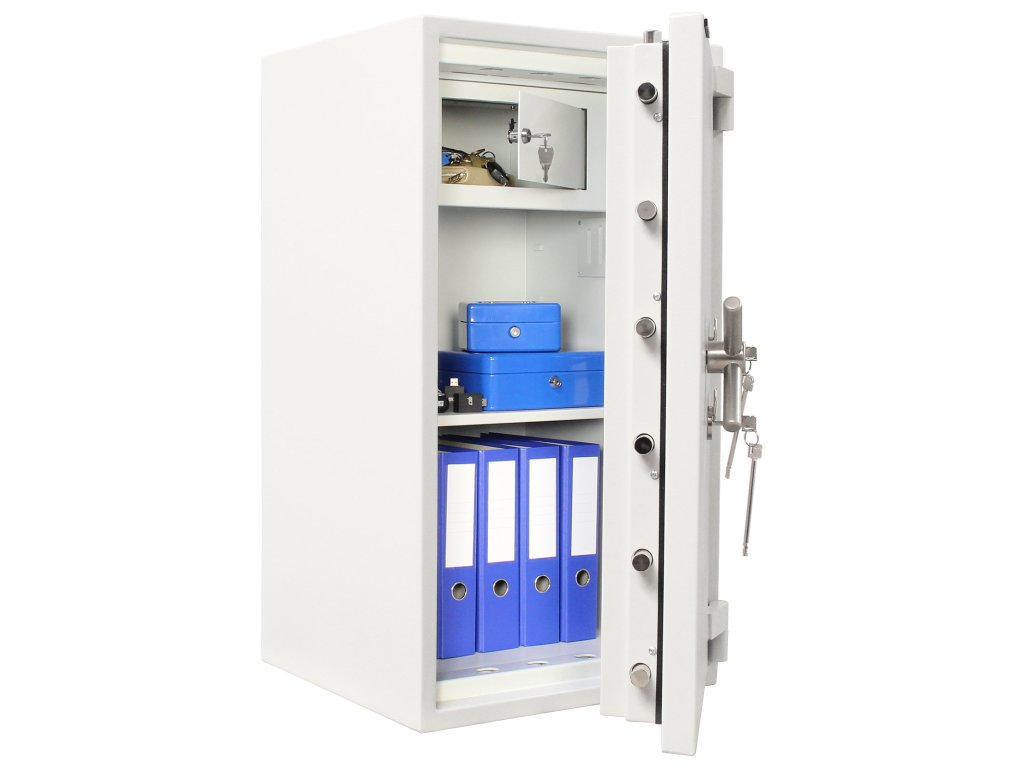 Hlavní výhody: 2 x certifikovaný trezorový zámek Bezpečnostní třída IV (ČSN EN 1143-1) Ohnivzdornost po dobu 30 minut pro papír 3-stranný uzamykací mechanizmus Korpus tloušťky 45 mm a dveře tloušťky 125 mm Vnitřní schránka s cylindrickým zámkem a 2 klíči 2 poličky uvnitř Příprava pro EMA Otevření dveří až do 180° Možnost doobjednání teleskopické zásuvky Možnost doobjednání teleskopické police Možnost doobjednání teleskopické registratury Otvory na ukotvení na spodní a zadní straně trezoru Šedý nábytkový trezor Projekt Fire Premium 100 disponuje 2 certifikovanými klíčovými zámkemi dodávaným spolu s 2 klíči. Trezor má také certifikát bezpečnostní třídy IV (ČSN EN 1143-1) a ohnivzdornost po dobu 30 minut pro papírové dokumenty. Trezor má i přípravu pro EMA. Celkově má trezor korpus hrubý 45 mm, přičemž samotné trezorové dveře jsou tloušťky 125 mm. Dveře lze otevřít do úhlu 180° a zamykají se 3-stranným uzamykacím mechanismem. Uvnitř se kromě 2 poliček nachází také praktická vnitřní schránka s cylindrickým zámkem a 2 klíči. Kromě toho je možné k trezoru doobjednat doplňkovou výbavu. Na spodní a zadní straně trezoru jsou připraveny otvory pro ukotvení. Kotevní materiál je součástí balení. Kování zámku zvyšuje celkovou vnější hloubku trezoru o 60 mm.