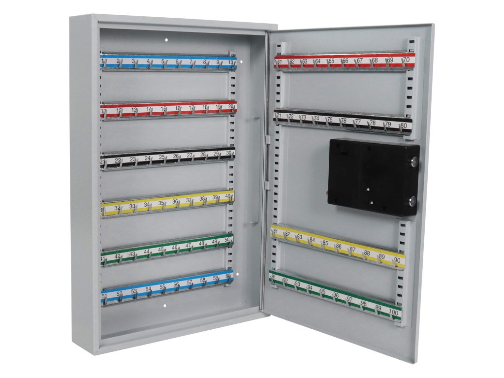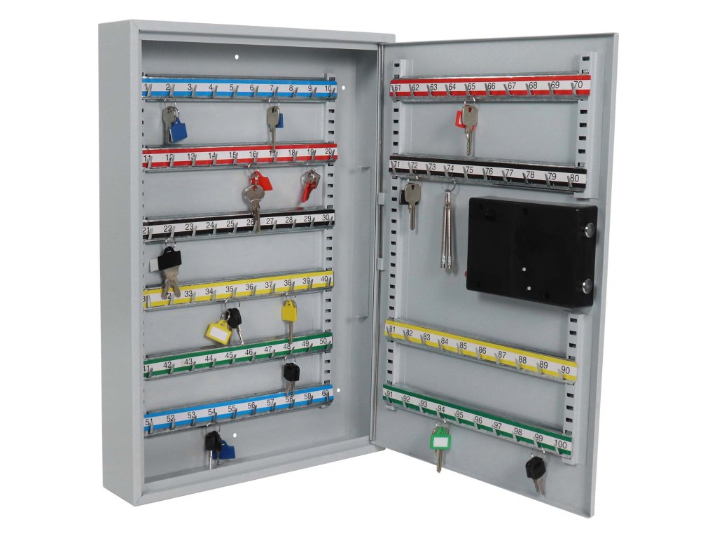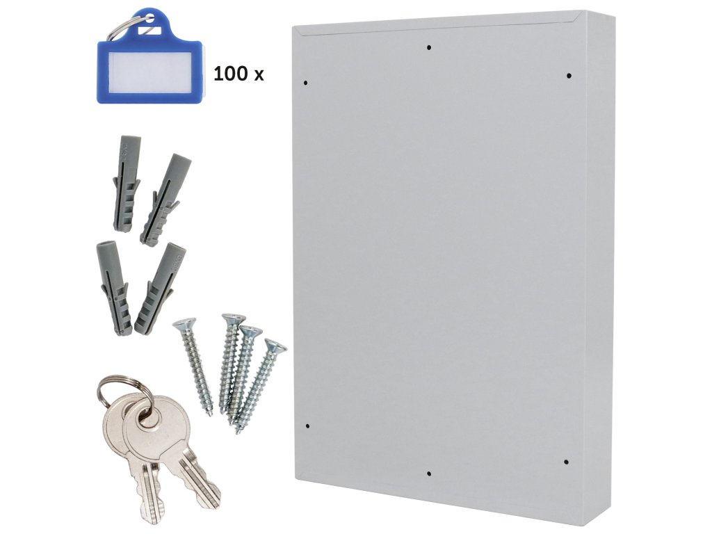 Hlavní výhody: Elektronický zámek Napájení 4 x 1,5V AA bateriemi (nejsou součástí balení) Pozinkované háčky na klíče (100 háčků) Dodávané spolu s 100 visačkami Výškově nastavitelná lišta s háčky Fixně umístěny háčky na lištách Mechanické nouzové otevírání s cylindrickým zámkem a 2 klíči Upevnění na stěnu Šedá skříňka na klíče z kvalitního ocelového plechu nabízí bezpečné a přehledné uložení všech vašich klíčů. Klíče jsou po uložení chráněny elektronickým zámkem, který je napájen čtveřicí 1,5V AA baterii. Přehledná klávesnice poskytuje pomocí LED diod okamžitou odezvu při zadávání kódu. Uvnitř skříňky se nacházejí výškově posuvné lišty, které mají na sobě fixně umístěny háčky. Háčky jsou pozinkované a dohromady jich je přesně 100, což odpovídá prostoru pro 100 klíčů. Jednotlivé lišty jsou barevně rozlišeny a každý háček má své číslo. Archivace klíčů je tak velmi jednoduchá a přehledná. V balení naleznete barevné visačky a také materiál na upevnění.