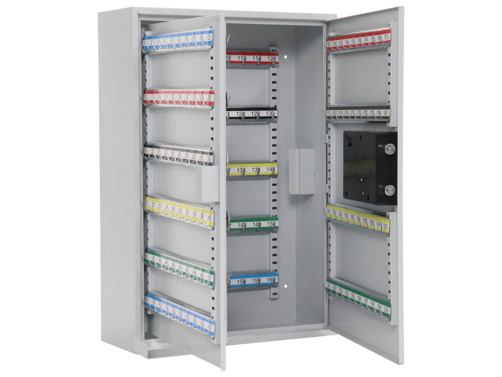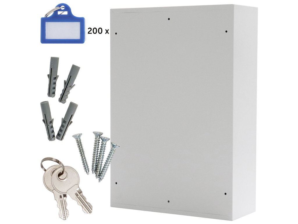 Hlavní výhody: Elektronický zámek s 2 klíči Pozinkované háčky na klíče (200 háčků) Napájení 4 x 1,5V AA bateriemi (nejsou součástí balení) Dodávané spolu se 200 visačkami Výškově nastavitelná lišta s háčky Fixní umístění háčků na lištách Upevnění na stěnu Mechanické nouzové otevírání s cylindrickým zámkem a 2 klíči Kvalitní ocelové provedení Skříňka na klíče vyrobena z kvalitního ocelového plechu nabízí nejen číselné ale také barevné roztřídění klíčů. Fixně umístěny háčky na klíče jsou pozinkované. Jednotlivé lišty lze výškově posouvat podle vašich potřeb. Celkově až 200 klíčů bude chráněných elektronickým zámkem s mechanickým nouzovým otevíráním v případě zapomenutí hesla nebo vybití baterii. Barevné visačky jsou obsaženy v balení a skvěle se hodí k rozlišení jednotlivých klíčů nebo menších svazků klíčů. Skříňku lze upevnit na zeď pomocí přiloženého upevňovacího materiálu.
