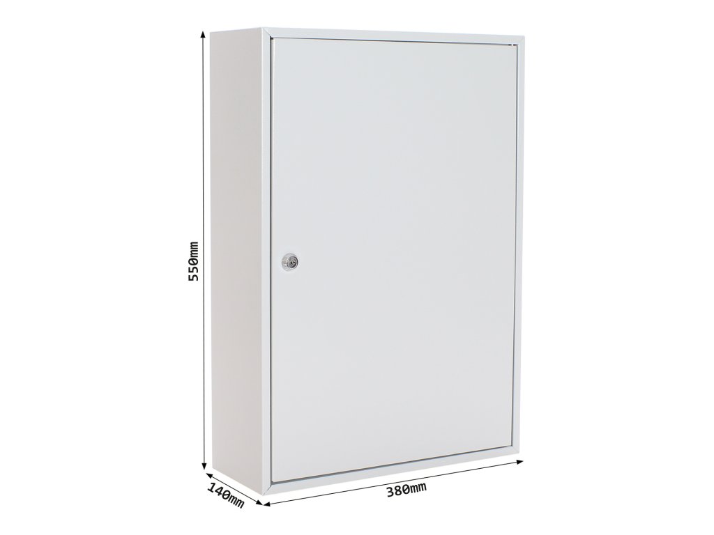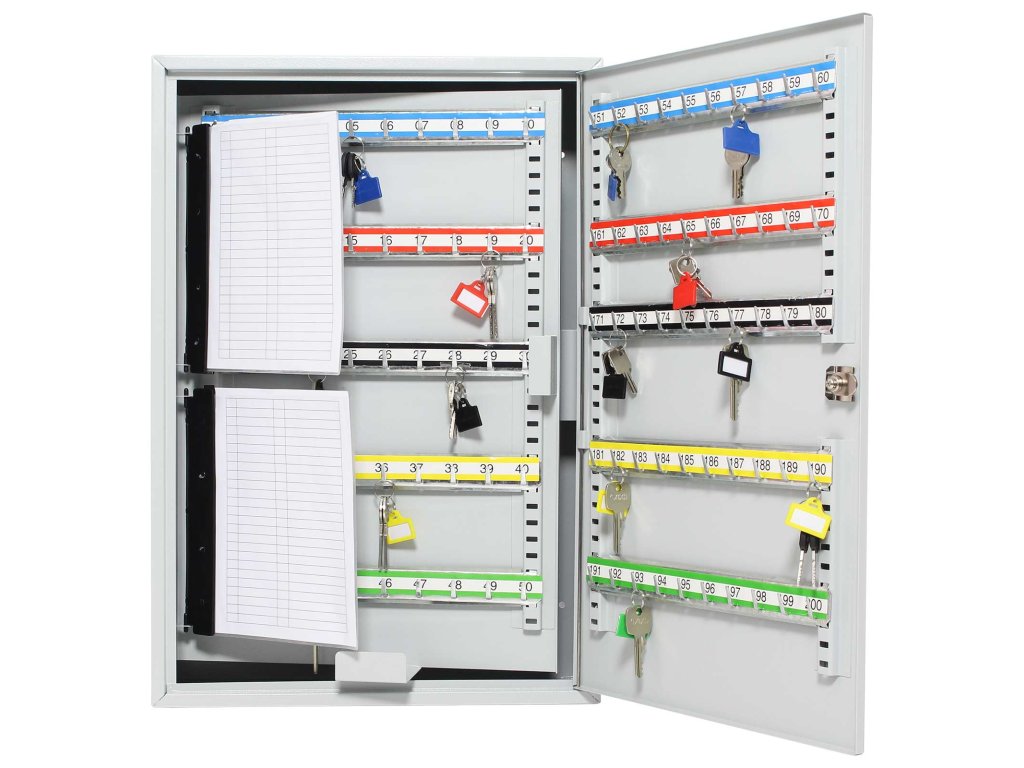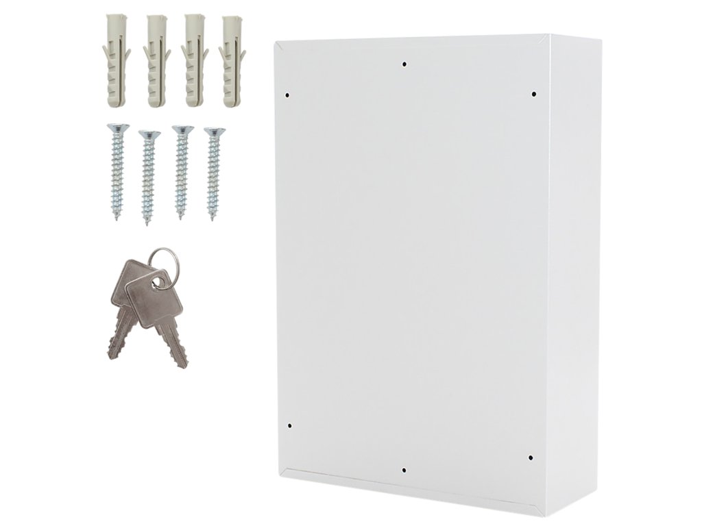 Hlavní výhody: Cylindrický zámek se 2 klíči Pozinkované háčky na klíče (200 háčků) Dodávané spolu se 200 visačkami Výškově nastavitelná lišta s háčky Fixní umístění háčků Upevnění na stěnu Kvalitní ocelové provedení Kvalitní ocelové provedení skříňky na klíče, do které se vejde až 200 klíčů. Fixně umístěny háčky na výškově posuvných lištách jsou přehledně očíslovány a také barevně rozlišené. Pokud by vám ani takové rozlišení nestačilo, najdete v balení i 200 barevných visaček, které můžete připevnit na klíč. Skříňku lze připevnit na zeď pomocí předpřipravených otvorů na zadní straně. Kotvící materiál je součástí balení.Doplňkové parametry