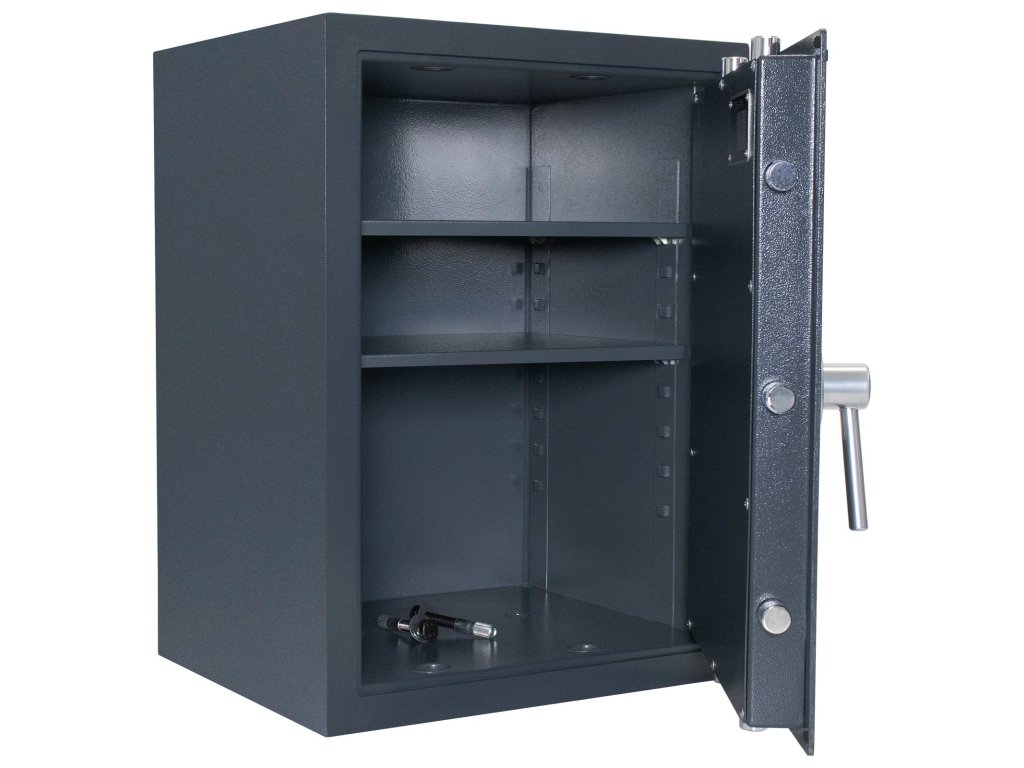 Hlavní výhody: Certifikovaný elektronický zámek Bezpečnostní třída 0 (ČSN EN 1143-1) Napájení 1 x 9V baterií (není součástí balení) Možnost úschovy i zbraní a munice podle č. 190/2003 Sb. z. 3-stranný uzamykací mechanizmus Dvouplaštový trezor 2 nastavitelné poličky uvnitř Tloušťka dveří 5 mm Otvory na ukotvení na spodní straně trezoru Nábytkový trezor Samoa 65 ve verzi s elektronickým zámkem nabízí dostatek prostoru pro uložení cenných dokladů, cenností, šperků, šanonů nebo i menších pokladniček. Podle platné legislativy je možné uschovat i krátké zbraně a munici. Trezor je držitelem bezpečnostní třídy 0 (ČSN EN 1143-1), přičemž zámek je napájen klasickou 9V baterií. V případě vybití jsou na vnější straně zámku nouzové kontakty pro přiložení náhradní baterie. Dveře trezoru se po zadání hesla uzamknou pomocí 3-stranného mechanismu. Dvouplášťové provedení uvnitř skrývá 2 výškově nastavitelné poličky, abyste si vnitřek rozvrhli podle svých potřeb. Na spodní straně trezoru se nacházejí připravené otvory pro ukotvení. Kotvící materiál je součástí dodávky. Kování zámku zvyšuje celkovou vnější hloubku trezoru o 60 mm.