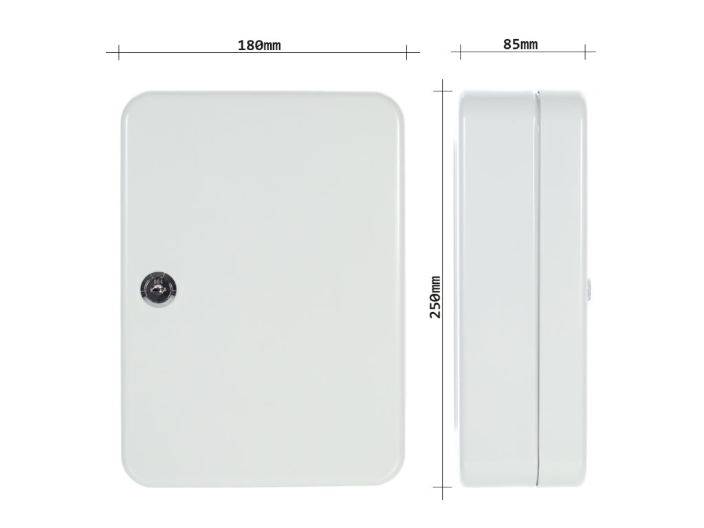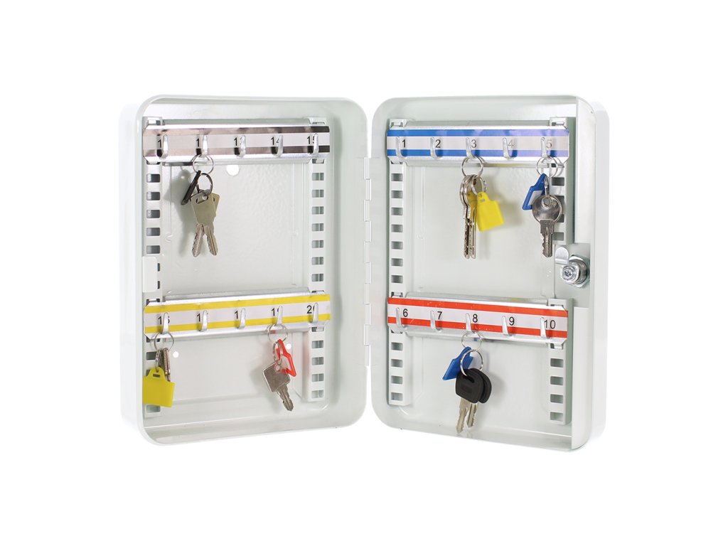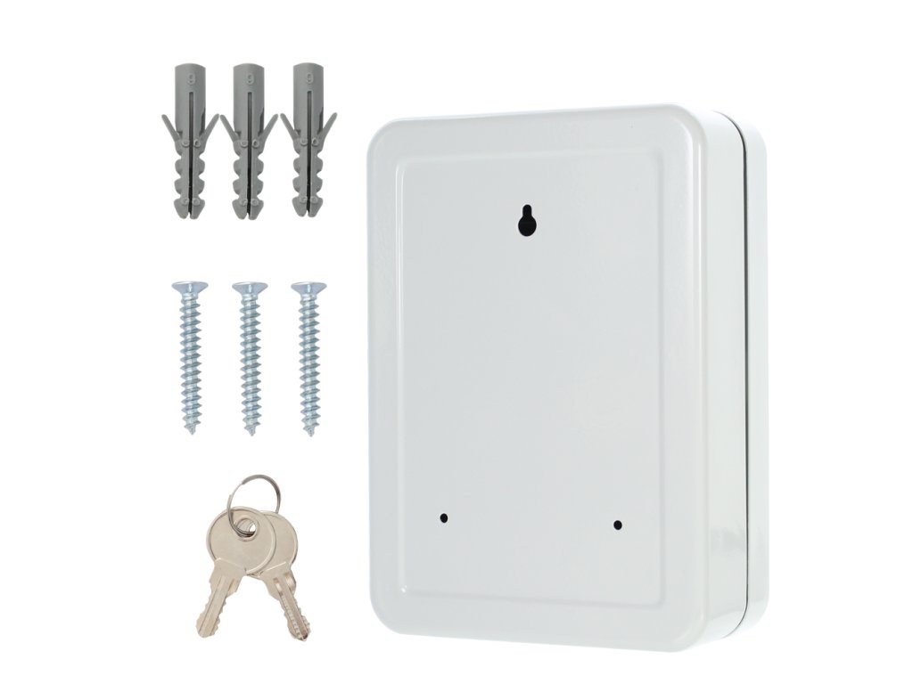 Hlavní výhody: Cylindrický zámek s 2 klíči Prostor pro 20 klíčů Pevně umístěné háčky Výškově nastavitelná lišta s háčky Kvalitní ocel Šedá skříňka na klíče nabízí dostatek prostoru pro zavěšení celkem 20 klíčů . Háčky uvnitř skříňky jsou pevně umístěny na výškově nastavitelné liště. Jednotlivé lišty jsou barevně rozlišeny a nad háčky jsou čísla pro lepší přehled. Skříňku na klíče je možné upevnit na stěnu např. v kanceláří. Potřebný materiál na upevnění je součástí dodávky.Doplňkové parametry