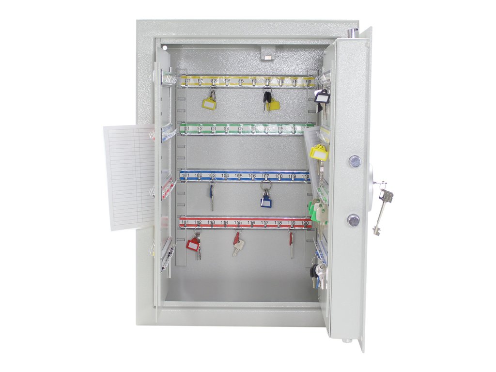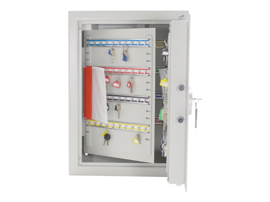 Hlavní výhody: Standardní trezorový zámek Jednoplášťový trezor Celkově 200 háčků pro 200 klíčů Fixně umístěny háčky na lištách Výškově posuvné lišty 3-stranný uzamykací mechanizmus Visačky v balení Otvory na zadní straně trezoru Šedý sejf na klíče ST 200 Premium disponuje standardním trezorovým zámkem dodávaným spolu s 2 klíči. Korpus skříně je jednoplášťový a dveře skříně se uzamykají 3-stranným uzamykacím mechanismem. Uvnitř skříně se nachází 200 háčků na klíče. Háčky jsou fixně umístěny na výškově posuvných lištách. Každá lišta je barevně odlišena a jednotlivé háčky jsou očíslovány. Spolu se skříní na klíče obdržíte i barevné visačky na klíče. Na zadní straně skříně jsou připraveny otvory pro upevnění. Materiál k upevnění je součástí balení. Kování zámku zvyšuje celkovou vnější hloubku sejfu o 15 mm.