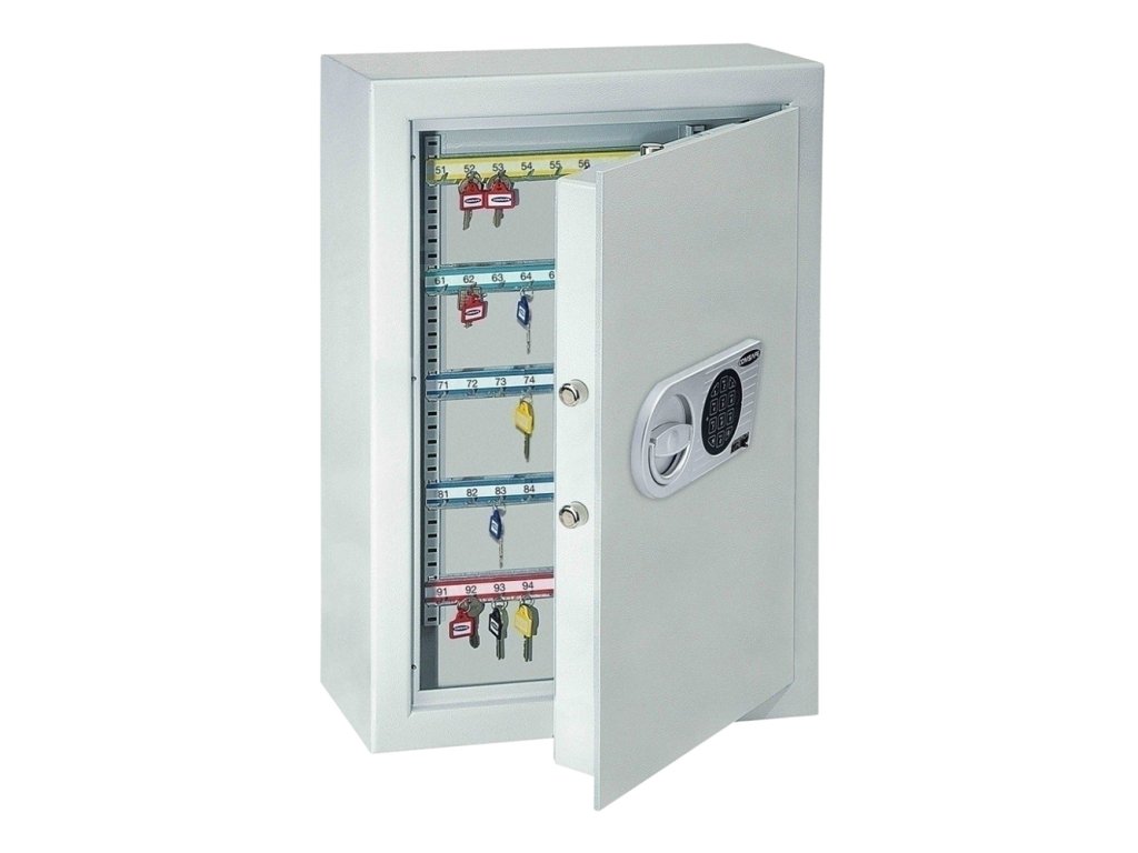 Hlavní výhody: Elektronický zámek Pozinkované háčky na klíče (300 háčků) Napájení 1 x 9V baterií (není součástí balení) Dodávané spolu s 300 visačkami Výškově nastavitelná lišta s háčky Fixně umístěny háčky na lištách Kvalitní ocelové provedení Otvory na ukotvení na zadní straně trezoru Trezor na klíče v šedé barvě s modelovým označením ST 300 EL Premium disponuje místem pro 300 klíčů. Má elektronický zámek s napájením klasickou 9V baterií. Trezor disponuje přehlednou klávesnicí pro pohodlné zadávání kódu. Celkově 300 pozinkovaných háčků na klíče je fixně umístěných na 2 vnitřních lištách trezoru. Jednoplášťové provedení disponuje korpusem tloušťky 5 mm a dveřmi tloušťky 50 mm. Háčky lze nastavovat výškově a to díky výškově nastavitelným lištám. Na zadní straně trezoru na klíče jsou připraveny otvory pro ukotvení. Kotvící materiál je součástí balení spolu s 300 visačkami. Kování zvyšuje celkovou vnější hloubku trezoru o 15 mm.