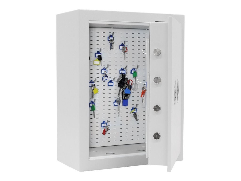 Hlavní výhody: Certifikovaný elektronický zámek Bezpečnostní třída I (ČSN EN 1143-1) Napájení 1 x 9V baterií (není součástí balení) Celkově pro 150 klíčů Háčky na klíče NEJSOU součástí balení 4-stranný uzamykací mechanizmus Korpus tloušťky 12 mm a dveře tloušťky 90 mm Víceplášťové korpus Otevření dveří až do 90° Otvory na ukotvení na spodní a zadní straně trezoru Šedý trezor na klíče z modelové řady STS nabízí místo pro uschování až 150 klíčů. Ochraňte své klíče kvalitním trezorem s certifikovaným elektronickým zámkem a certifikátem bezpečnostní třídy I (ČSN EN 1143-1). Napájení zámku a klávesnice je zajištěno klasickou 9V baterií. Dveře tloušťky 90 mm disponují 4-stranným uzamykacím mechanismem a uvnitř trezoru se nachází také 1 panel na klíče. Na spodní a zadní straně trezoru jsou připraveny otvory pro ukotvení. Kotvící materiál je součástí balení. Upozorňujeme, že součástí balení nejsou háčky na klíče a ani visačky. Kování zámku zvyšuje celkovou vnější hloubku trezoru o 60 mm.