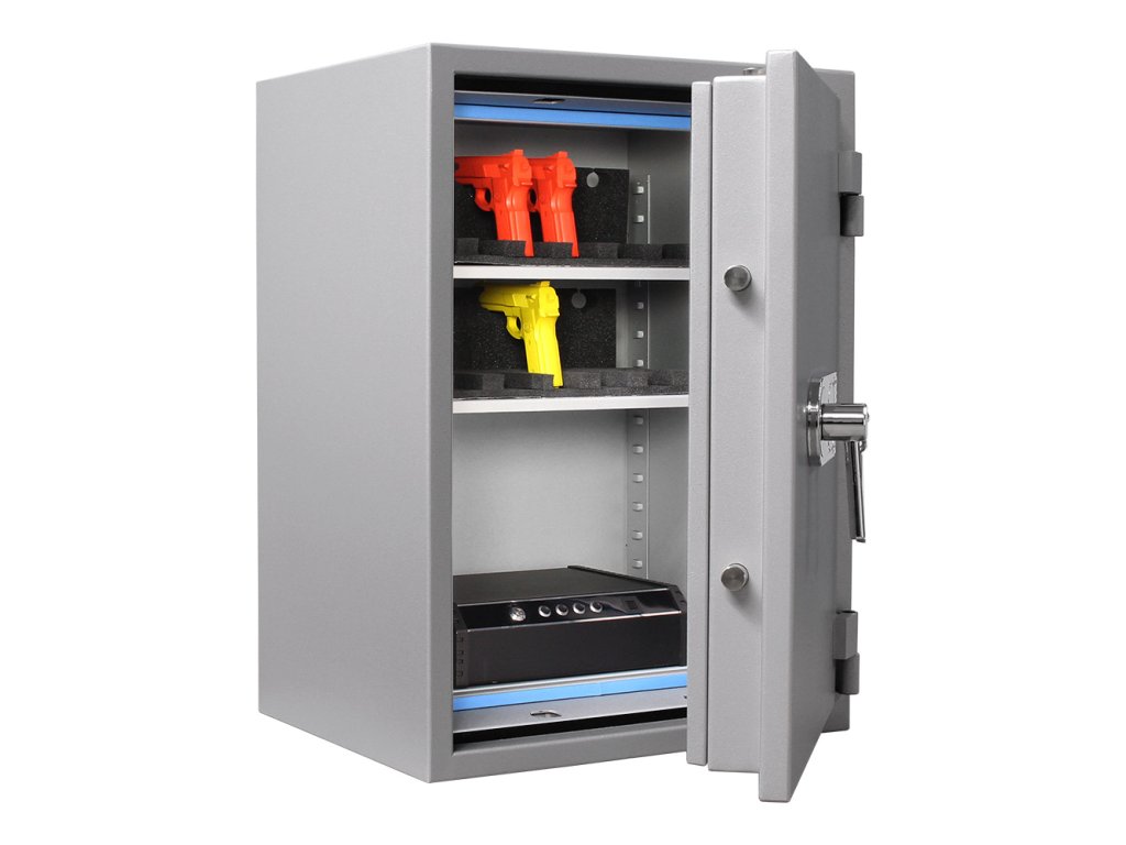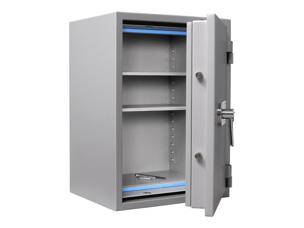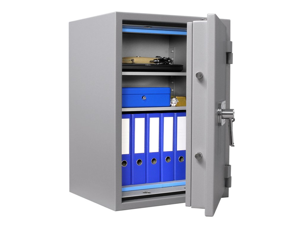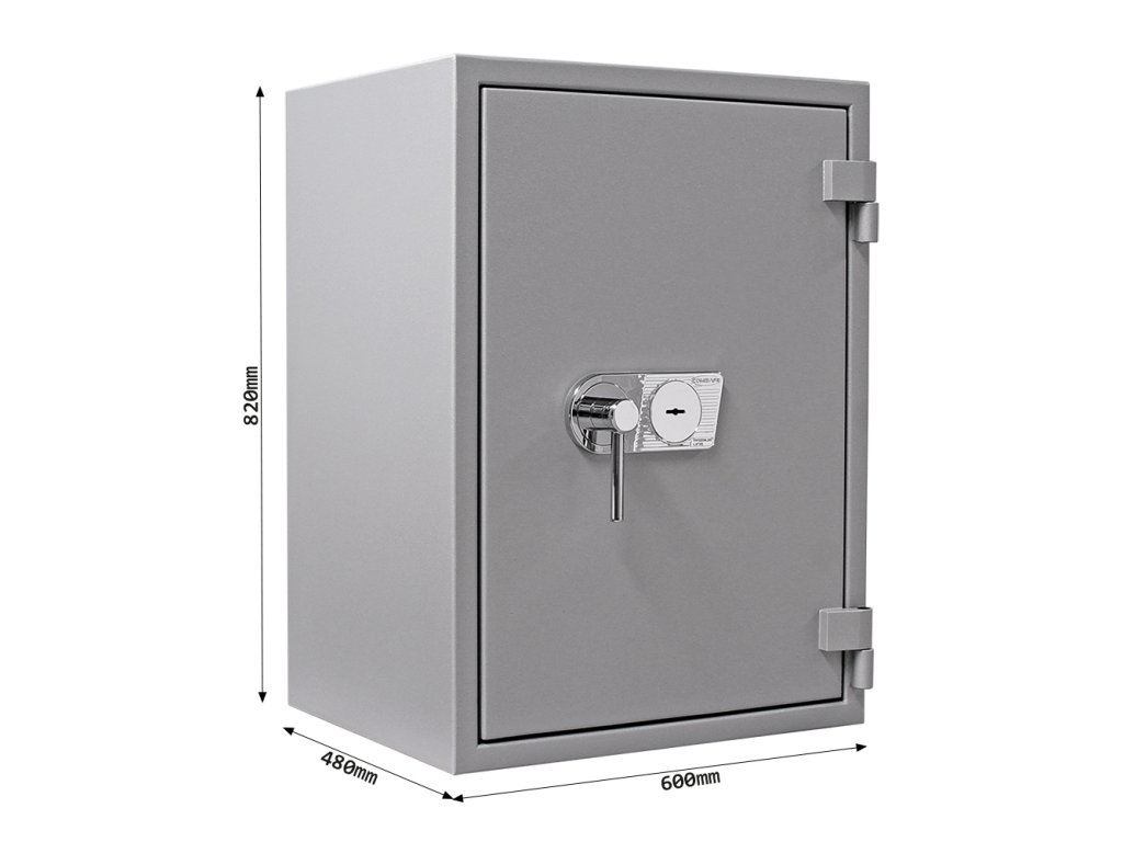 Hlavní výhody: Certifikovaný trezorový zámek Bezpečnostní třída I (ČSN EN 1143-1) Ohnivzdornost po dobu 60 minut pro papír Možnost úschovy i zbraní a munice podle č.190 / 2003 Sb. z. 4-stranný uzamykací mechanizmus Speciální výplň mezi plášti trezoru 2 poličky uvnitř Otevření dveří až do 180° Možnost doobjednat vnitřní schránku Možnost doobjednat teleskopické police Možnost doobjednat teleskopickou registraturu Příprava pro EMA Otvory na ukotvení na spodní straně trezoru Nábytkový ohnivzdorný trezor disponuje certifikovaným trezorovým zámkem, který je dodáván spolu s 2 klíči. Trezor má bezpečnostní třídu I (ČSN EN 1143-1) a ohnivzdornost. V případě požáru ochrání uložené papírové dokumenty minimálně po dobu 60 minut. Kromě zmíněných dokumentů je možné v trezoru uložit cennosti, šperky, šanony ale i krátké zbraně a munici. Pro lepší organizaci uložených věcí je trezor vybaven 2 poličkami uvnitř. Dveře trezoru je možné otevřít až do úhlu 180°. Spodní strana má připravené otvory pro ukotvení. Kotvící materiál je součástí balení. Kování zámku zvyšuje celkovou vnější hloubku trezoru o 60 mm.