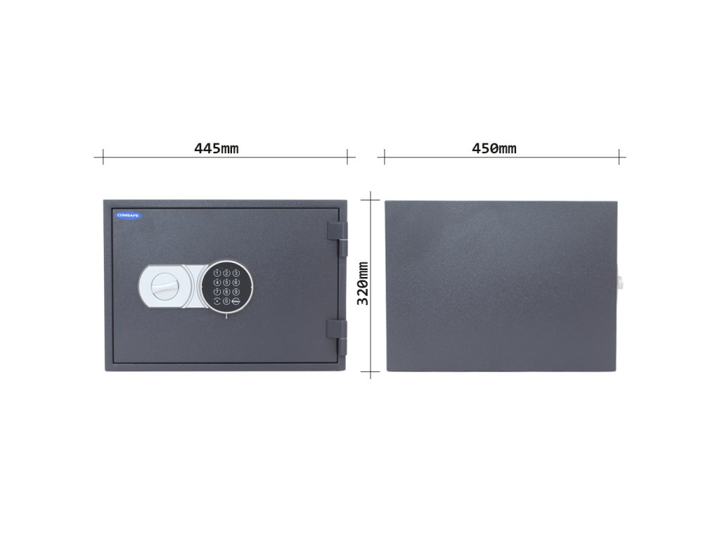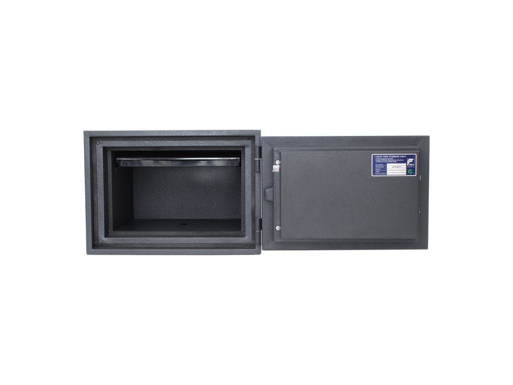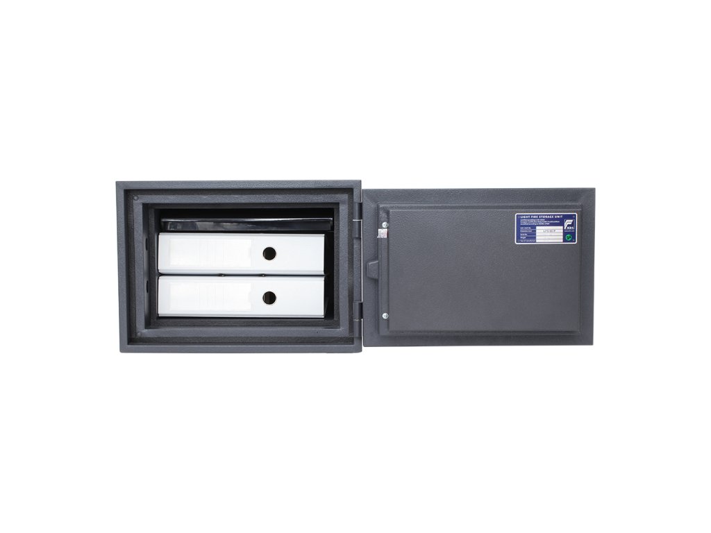 Hlavní výhody: Elektronický zámek bez nouzového otevírání Třída požární odolnosti S60P (EN 15659) Napájení 4 x 1,5V AAA baterií (není součástí balení) Speciální výplň proti ohni (60 minut pro papír) Malá přihrádka v horní části na dokumenty Dvouplášťový sejf z oceli Otvory na ukotvení na spodní straně trezoru Kvalitní ocelový sejf s bezpečným elektronickým zámkem, který nedisponuje soupravou nouzových klíčů. Sejf je napájen klasickými 1,5V AAA bateriemi, které zajistí potřebnou energii pro správné fungování zámku. Testovaný protipožární materiál, kterým je sejf vyplněn zabrání poškození vlivem ohně, protože disponuje certifikátem požární odolnosti třídy S60P (EN 15659). Papír je tak chráněn až po dobu 60 minut. Uvnitř sejfu najdete i malou přihrádku kde se vejdou cenné dokumenty, papíry nebo cestovní doklady. Sejf připevníte k podlaze pomocí přiloženého kotvícího materiálu. Kování zvyšuje celkovou vnější hloubku sejfu o 60 mm.