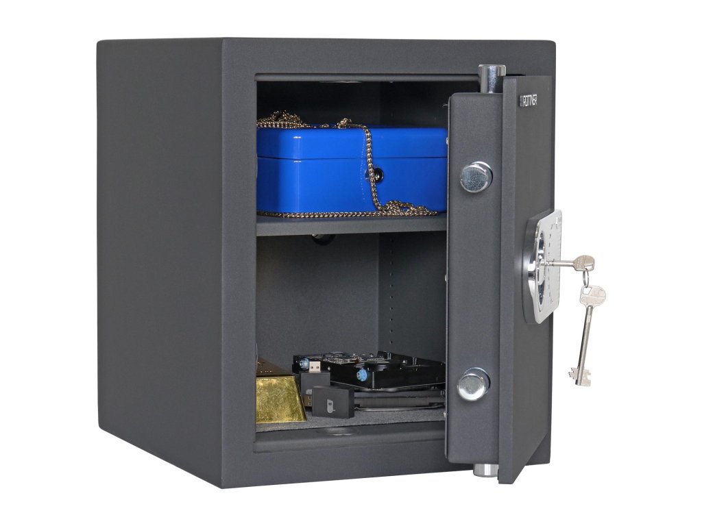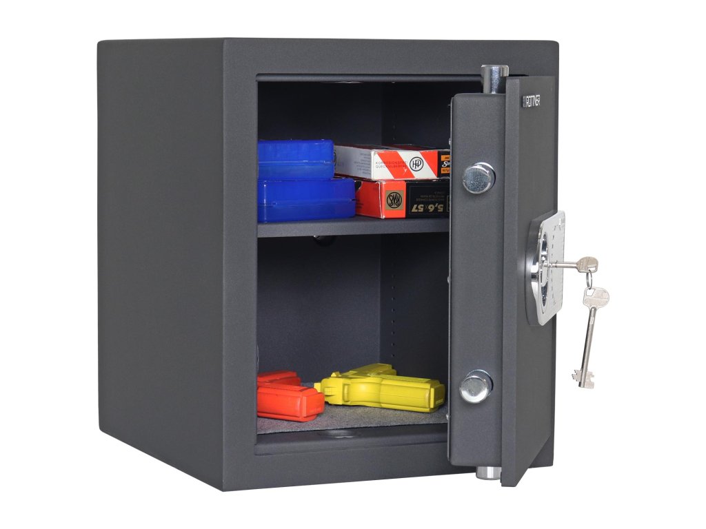 Hlavní výhody: Certifikovaný trezorový zámek Bezpečnostní třída I (ČSN EN 1143-1) Možnost úschovy i zbraní a střeliva podle č.190 / 2003 Sb. z. Trezor má dvouplášťové dveře s tloušťkou 12 mm Dveře trezoru lze otevřít v úhlu 90° 3-stranný uzamykací mechanizmus Dodávané s 1 vyjímatelnou poličkou Otvory na ukotvení na spodní a zadní straně trezoru Menší trezor s bezpečným trezorovým zámkem a 2 klíči disponuje bezpečnostní třídou I. Uložená menší cennosti, šperky, cestovní doklady nebo i šanony tak budou v dokonalém bezpečí. Zároveň v trezoru kromě zmíněných věcí můžete uschovat i krátké zbraně a munici. Dvouplášťové dveře s tloušťkou 12 mm. Pro lepší organizaci uvnitř trezoru je možné použít dodávanou vyjímatelnou poličku. Trezor jednoduše upevníte pomocí připravených otvorů na zadní a spodní straně. Kotvící materiál je součástí balení. Kování zámku zvyšuje celkovou vnější hloubku trezoru o 15 mm.