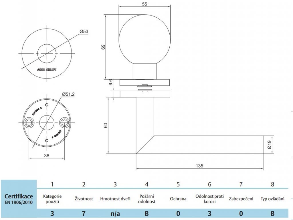 - tvar kliky L průměr 19mm, pevná koule průměr 55mm