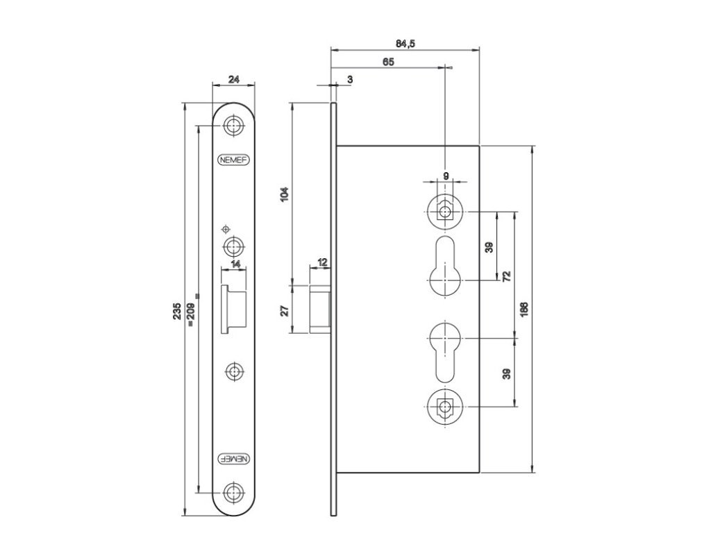 Zadlabací zámek mechanický vložkový - s panikovou funkcí pro dvoukřídlé dveře NEMEF 1901 - aktivní křídlo